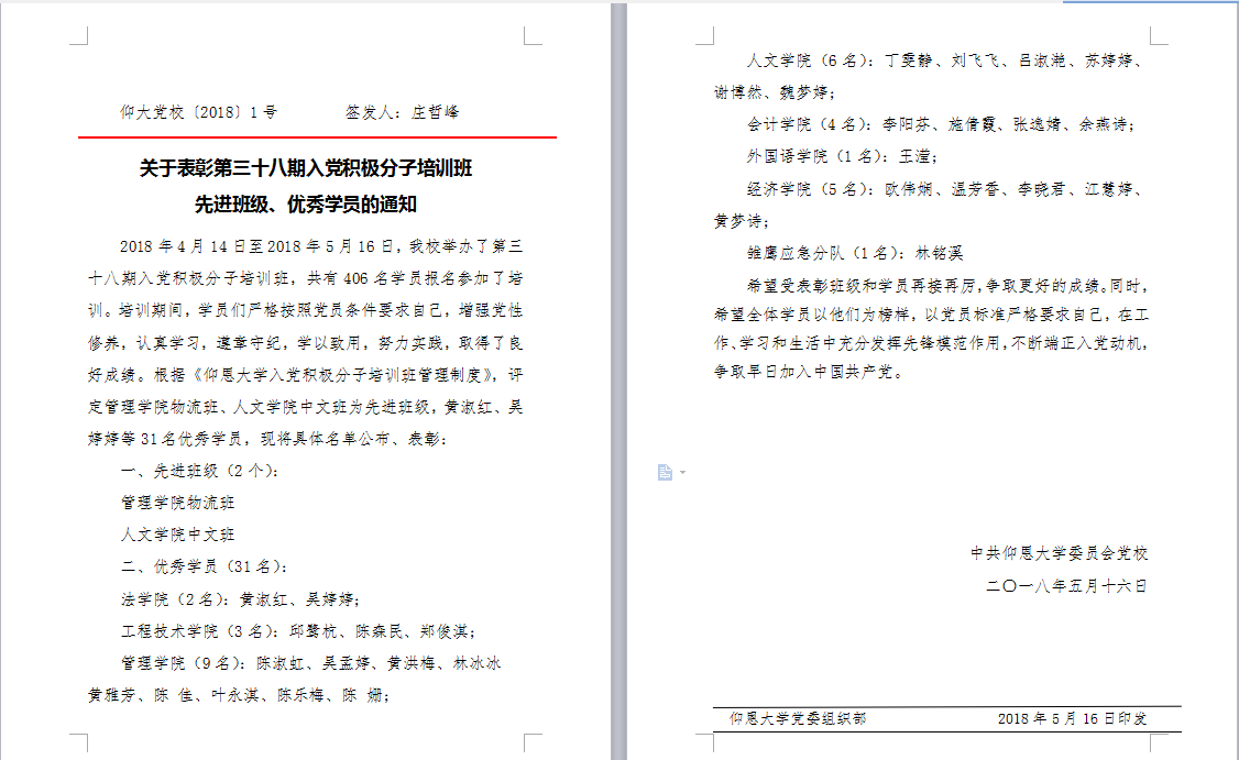 (表彰通知文件) 5月16日,在校党委组织部举办的培训班结业典礼上,Beat365唯一官方网站物流班(物流管理系学生党支部)荣获第三十八期入党积极分子培训班“优秀班级称号”,此外我院共有陈淑虹、吴孟婷、黄洪梅、林冰冰、黄雅芳、陈佳、叶永淇、陈乐梅、陈姗等9名同学被评为“优秀学员”。(Beat365唯一官方网站党总支 杜结实)
