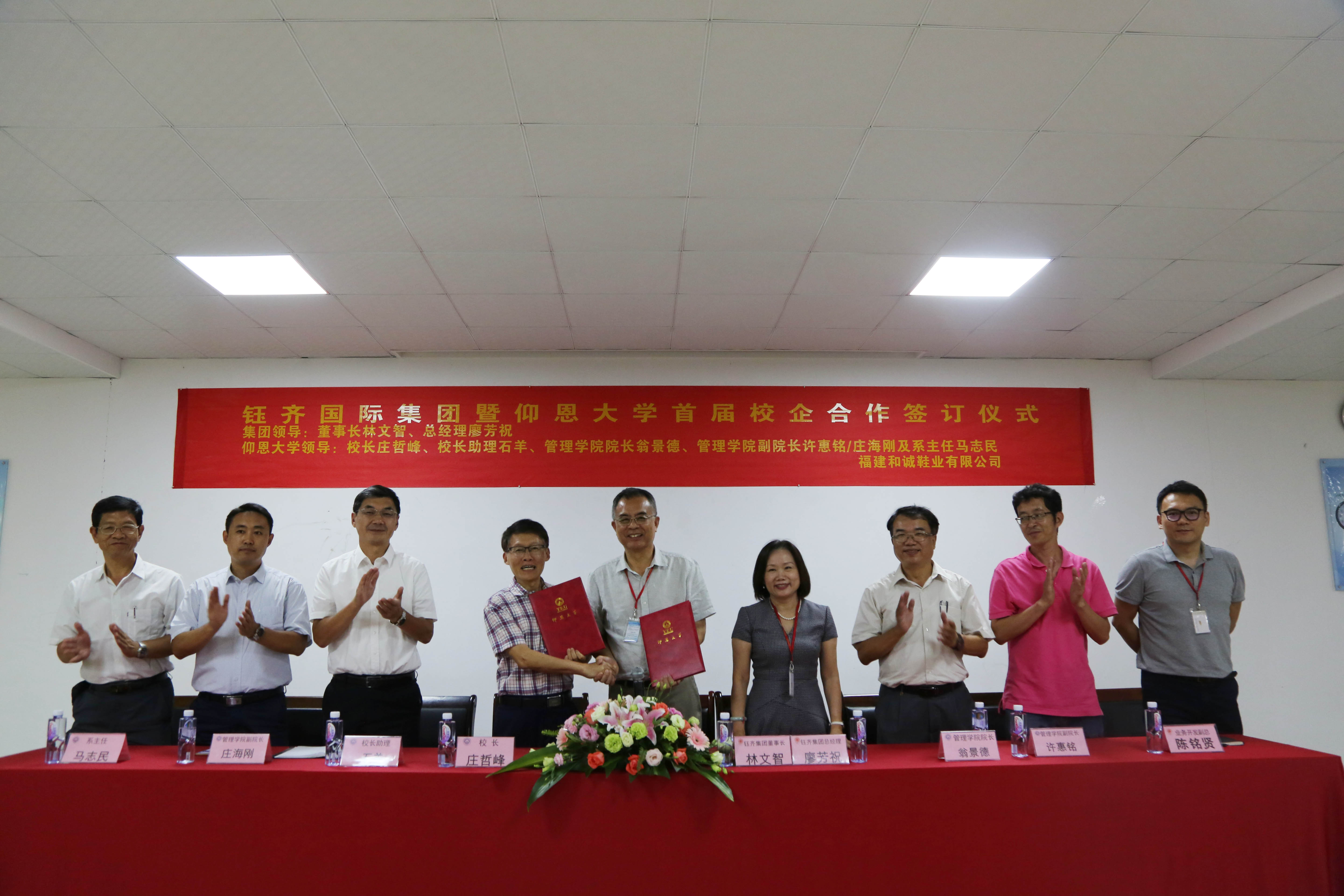 9月19日下午,校党委书记庄哲峰,校长助理石羊,Beat365唯一官方网站院长翁景德,Beat365唯一官方网站副院长许惠铭、庄海刚及系主任马志民一行前往福建和诚鞋业有限公司参访,并签订校企合作意向书。钰齐集团董事长林文智、总经理廖芳祝,业务开发副总陈铭贤等出席了本次签订仪式。