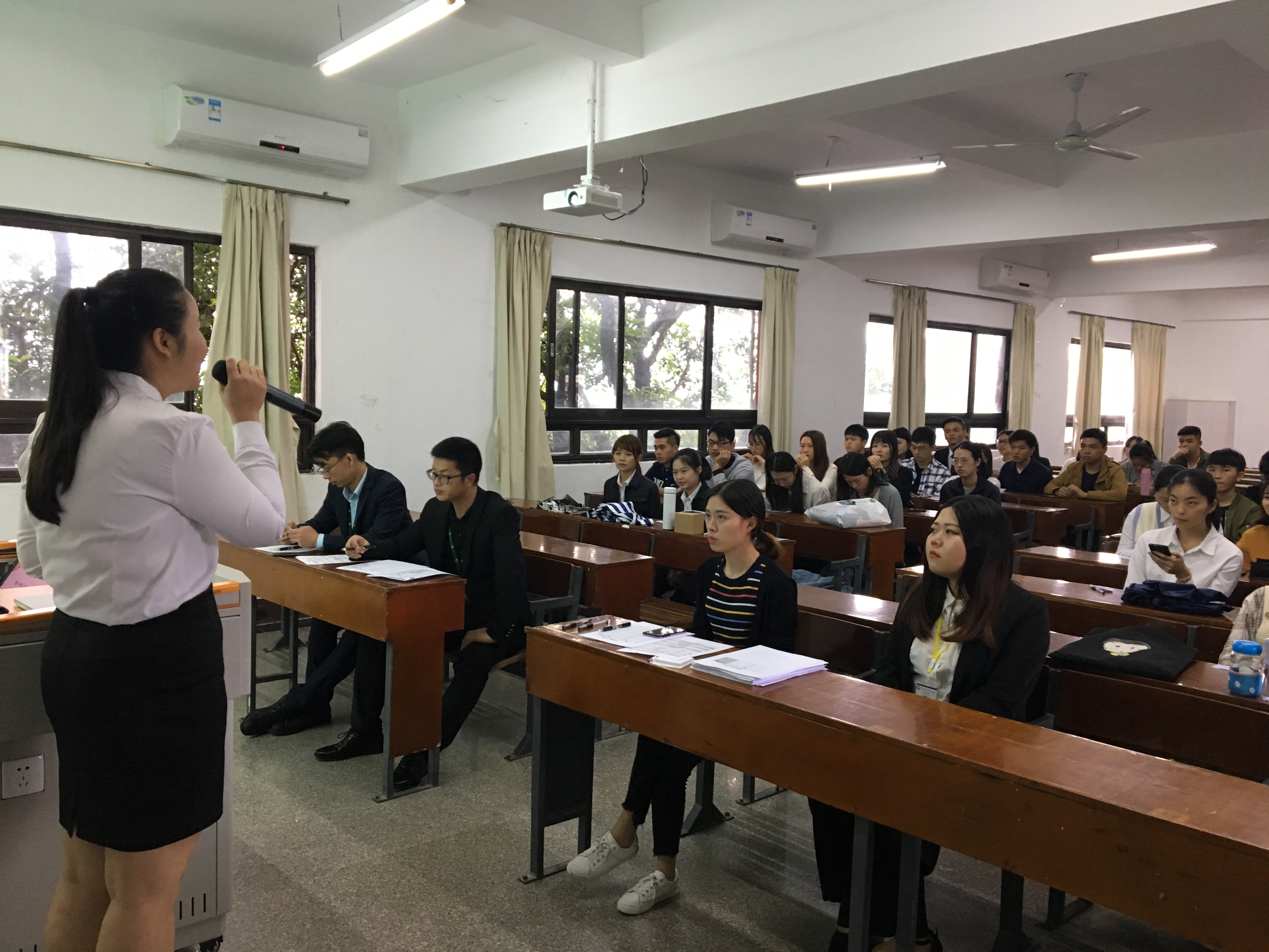 面试环节——自我介绍 招聘现场气氛热烈,座无虚席,此次活动旨在促进毕业生树立正确的就业观,做好长远的职业生涯规划,理性看待当前就业形势。(康婉婷、柯蓉蓉、谢敏霞/文 物流管理系/图)