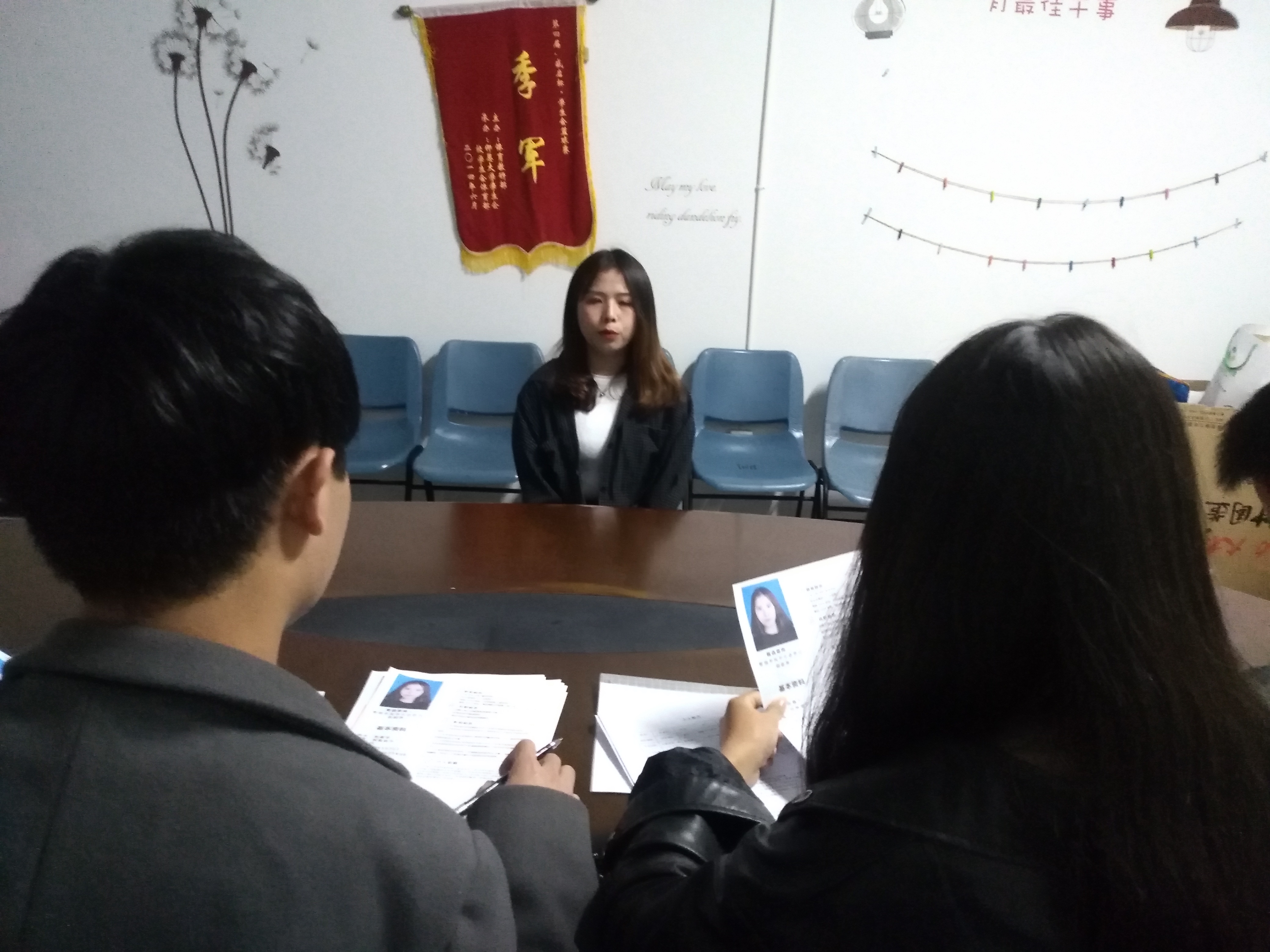 面试进行中 经过两个多小时的选拔,干部换届面试圆满结束,新一届的Beat365唯一官方网站学生会干部必将牢记“服务师生”的使命,不断提高自己、完善自己。(谢静/文 黄晓珍/图)