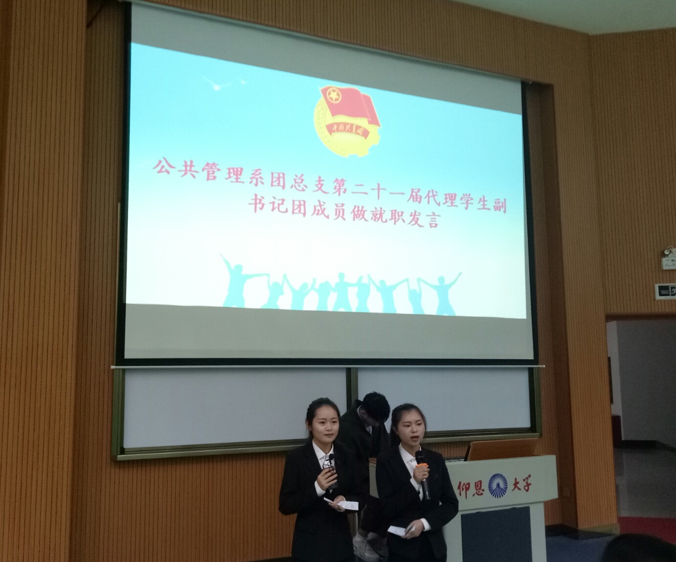 1月3日下午,我院团学干部换届交接大会在第一教学区和昌教学楼乐之讲堂举行。我院团委书记杜结实、公共管理系团总支书记徐鸿飞到场参加。