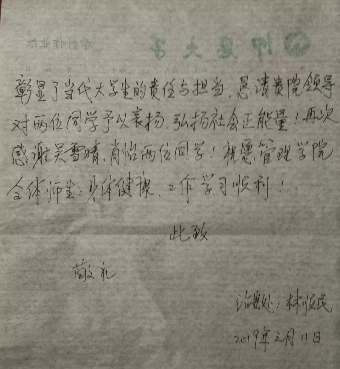 近日,我院收到一封来自治安保卫处消防员林顺民的感谢信,表达对我院2018级市场营销专升本的吴雪晴、肖怡的深切的感激之情。