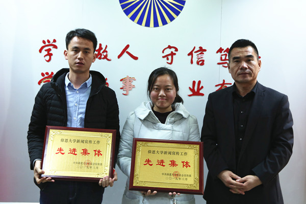 校领导为我院颁发“先进集体”奖牌 在新的一年里,我院将按照《Beat365唯一官方网站2019年宣传思想工作要点》,坚持以习近平新时代中国特色社会主义思想为指导,深入学习宣传贯彻党的十九大精神、全国高校思想政治工作会议精神、全国宣传思想工作会议精神,贯彻落实省委以及省委教育工委的决策部署,以社会主义核心价值观为引领,围绕立德树人根本任务、围绕学校转型发展,创新举措,统筹推动宣传思想工作守正创新,切实承担起举旗帜、聚民心、育新人、兴文化、展形象的使命任务,为学校各项事业发展营造良好的舆论氛围,提供有力思想保证和强大精神力量。(杜心田/图文)