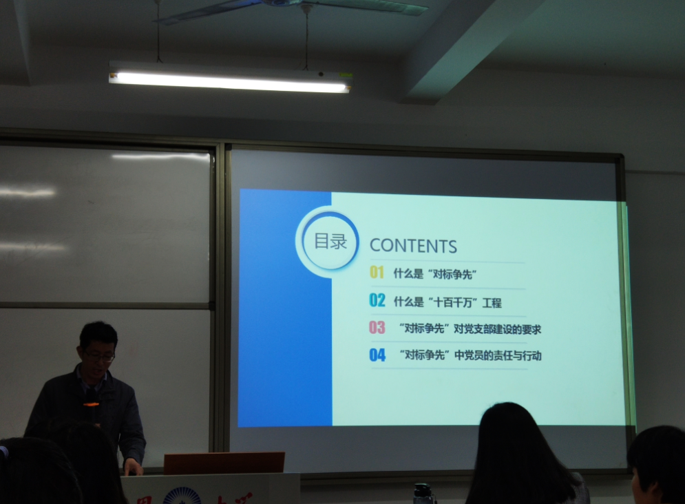 学院党总支书记许惠铭讲党课 同时,许惠铭以“对标争先中党员的责任与行动”为主题,为全体师生党员上了一堂内涵丰富而又深刻生动的党课。此次党课重点围绕以下四个方面的内容展开:一、什么是“对标争先”;二、什么是“十百千万”工程;三、“对标争先”对党支部建设的要求;四、“对标争先”中党员的责任与行动。