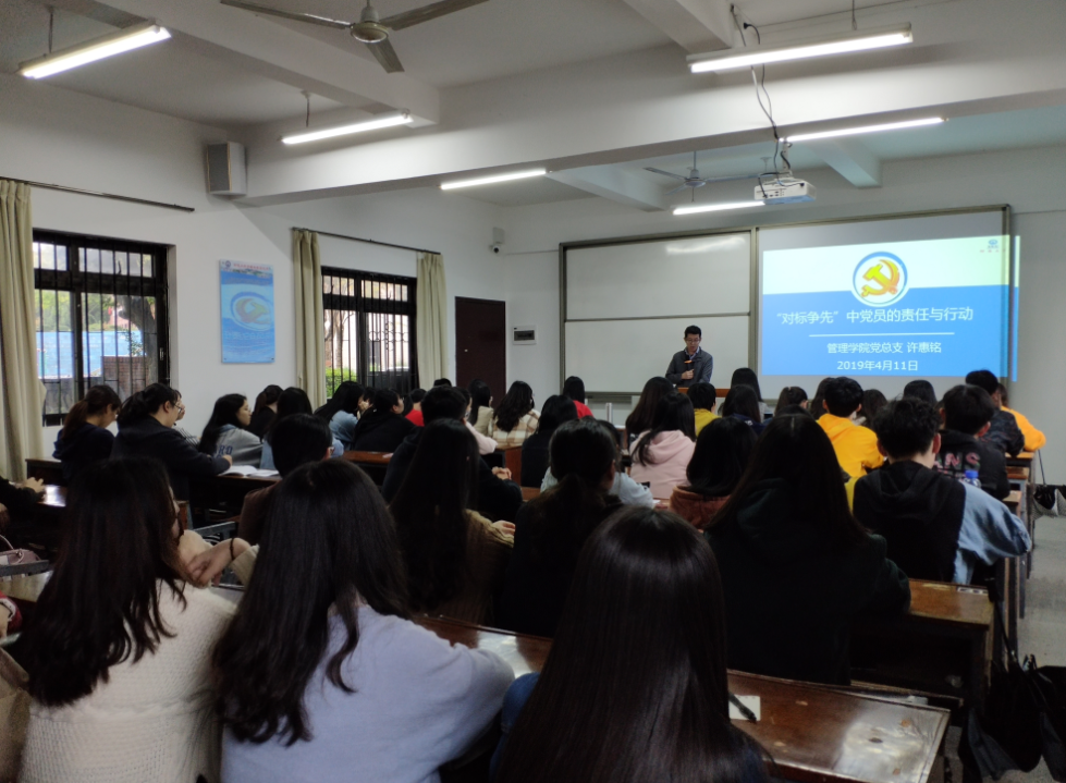 全院党员大会现场 会上,许惠铭就我院党总支入选全省党建工作标杆院系培育创建单位和市场营销系学生党支部入选全省党建工作样板支部培育创建单位开展“对标争先”动员,要求我院各基层党支部要以先进为榜样,深入贯彻落实习近平新时代中国特色社会主义思想和党的十九大精神,按照新时代党的建设总要求,严格对标看齐,继续改革创新,努力争创先进,全面提升基层党组织组织力。