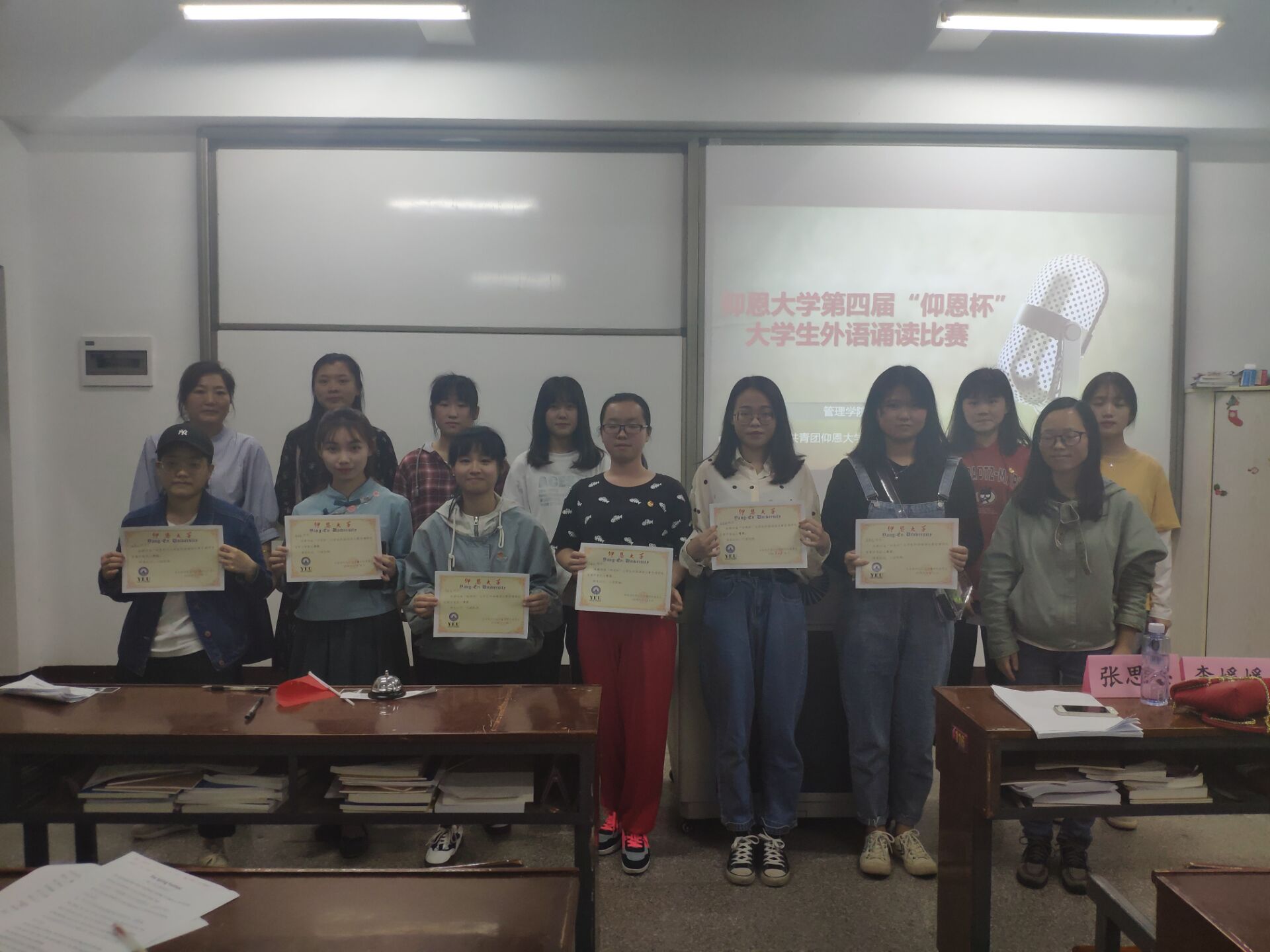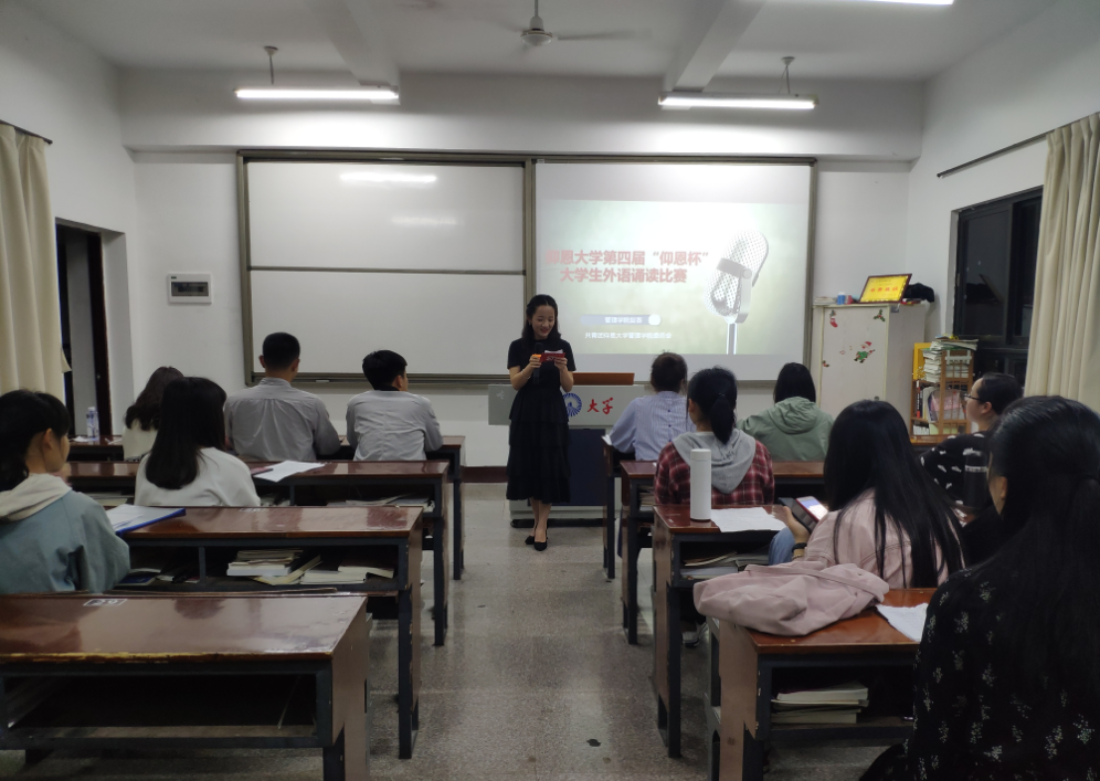 4月18日晚,第四届“仰恩杯”大学生外语诵读比赛Beat365唯一官方网站复赛在第一教学区共和楼323举行。复赛由我院团委主办,各系团总支协办,本次比赛邀请了外国语学院的张思思老师和李媛媛老师担任评委。