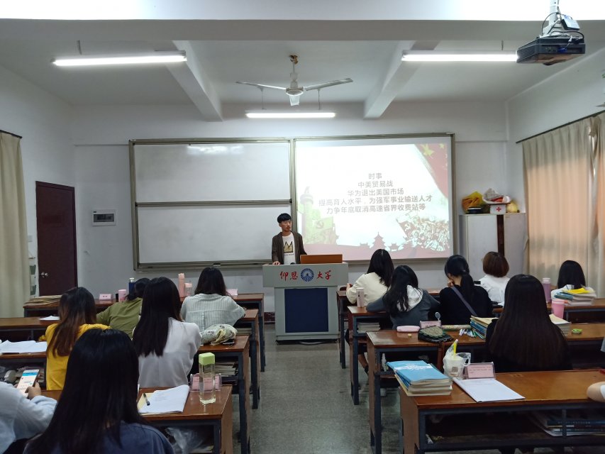 为了提高现代大学生时政新闻的关注度、培养政治大局意识,激发爱国主义情怀, 5月23日下午,物流管理系学生党支部在共和楼307开展了爱党爱国教育活动之“关注时事”,该活动由何亿杰同志主持,围绕“中美贸易战”、“华为公司退出美国市场”、“力争年度取消高速公路省界收费站”等最新新闻展开讨论,同志们互相交流想法和见解,初步了解国家现状以及未来发展趋势。
