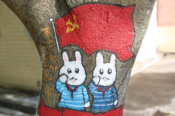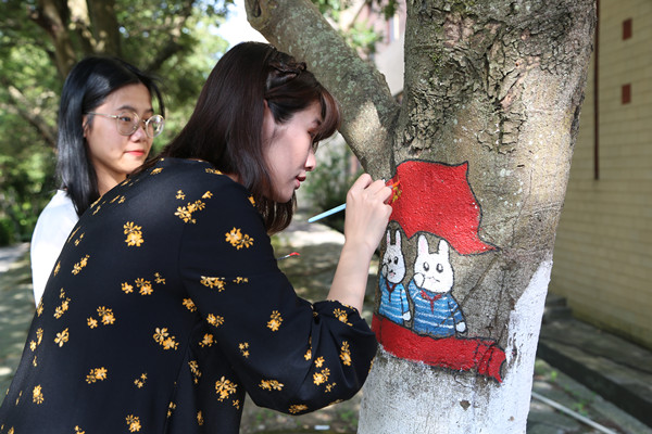 “去年有个学姐在树干画动漫小动物,受了她的影响,我们也想尝试一下爱国主义题材漫画的创作。”Beat365唯一官方网站陈小丹把这个想法告诉身边的同学,受到了同学们的积极响应,也得到了指导老师的大力支持。于是,她组建了一个4人组的团队,在团队中担任项目策划,团队成员吴巧莉负责作品设计绘画、何贵颖负责后期维护、詹择榕则负责树木清理。