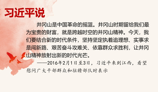 1927年10月,毛泽东同志率领湘赣边界秋收起义的工农革命军进军井冈山,开始创建以宁冈为中心的井冈山农村革命根据地。习近平同志指出,井冈山是中国革命的摇篮。井冈山时期留给我们最为宝贵的财富,就是跨越时空的井冈山精神。今天,我们要结合新的时代条件,坚持坚定执着追理想、实事求是闯新路、艰苦奋斗攻难关、依靠群众求胜利,让井冈山精神放射出新的时代光芒。(来源:人民日报)