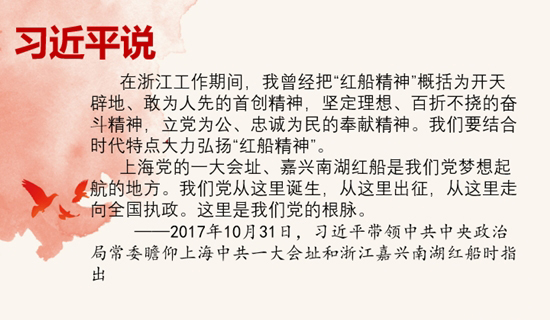 2005年6月21日,时任浙江省委书记的习近平同志在光明日报发表文章《弘扬“红船精神” 走在时代前列》(查看全文),首次提出并阐释了“红船精神”,阐述了中国共产党的源头精神。2017年10月31日,党的十九大闭幕仅一周,习近平总书记带领新一届中共中央政治局常委专程前往上海和浙江嘉兴,瞻仰中共一大会址和嘉兴红船,回顾建党历史,重温入党誓词,宣示新一届党中央领导集体的坚定政治信念。