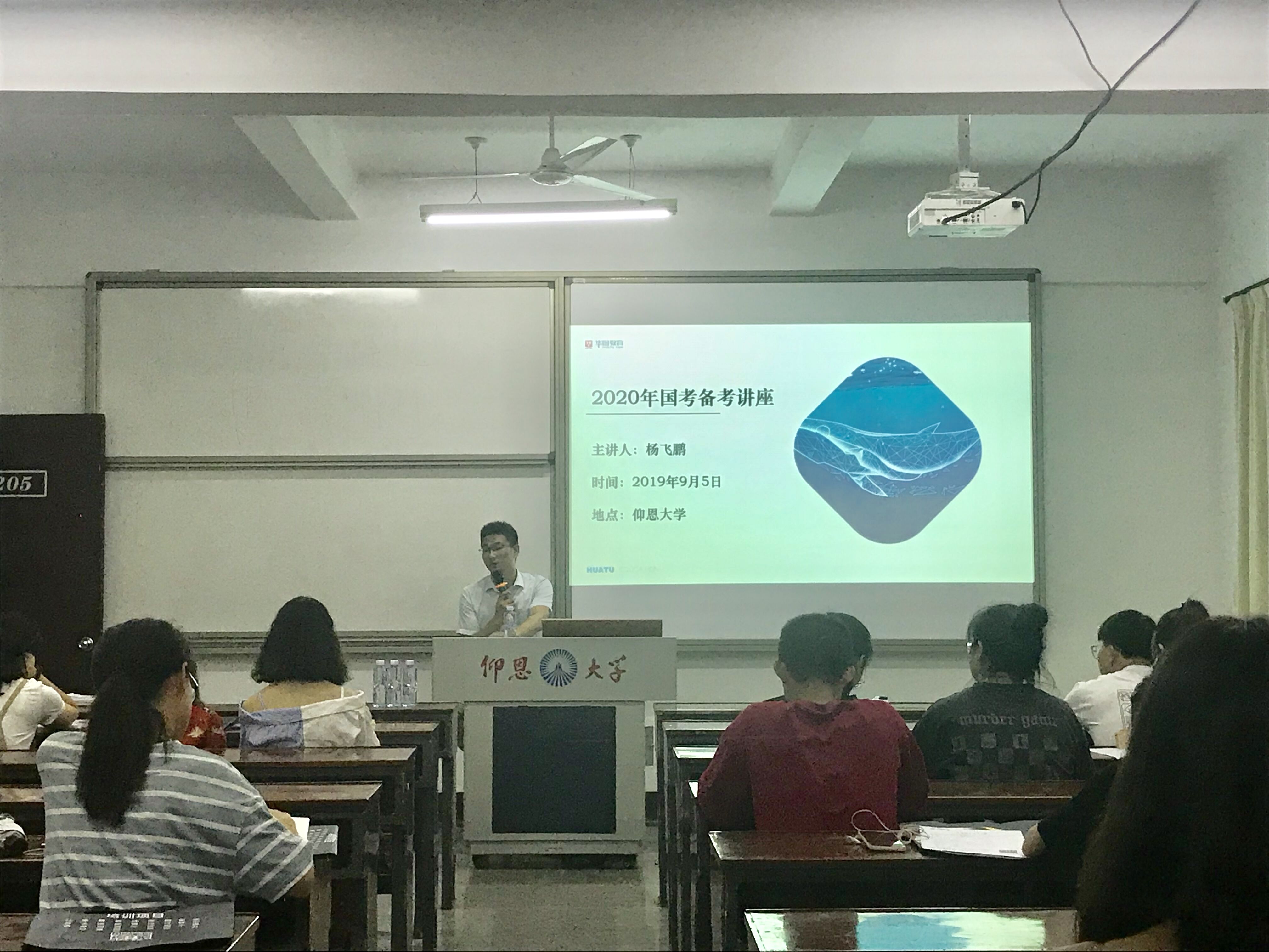 为加强大学生对国考的了解,提高大学生的备考水平和考试能力,9月5日晚,我院学生会携手华图教育于第一教学区共和楼205开展2020年国考备考讲座。本次讲座由华图教育杨飞鹏老师主讲。