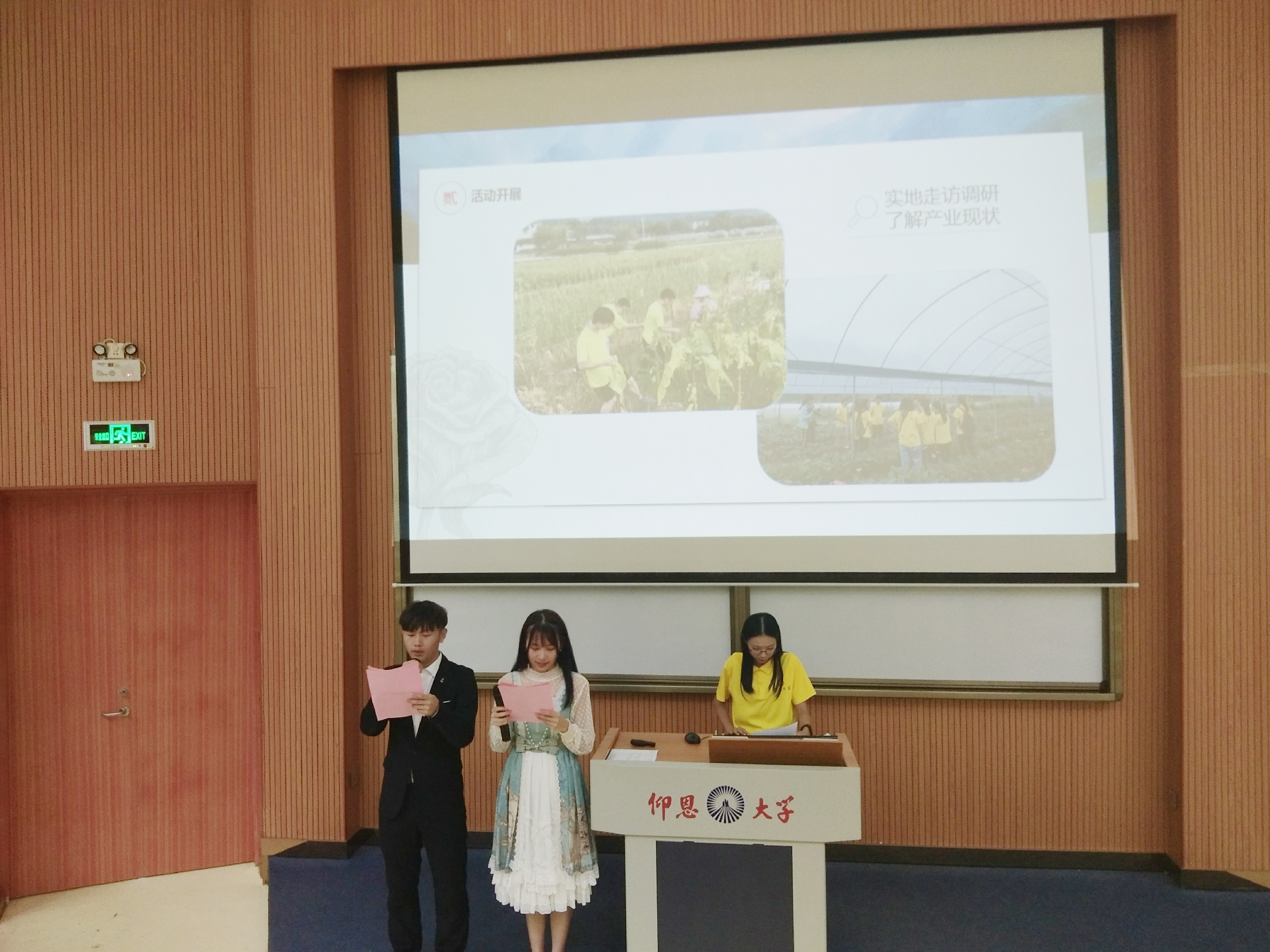 报告会现场 本次汇报共有10支专业实践队和10支社会实践队。每支实践队都进行了精彩的汇报,一张张生动鲜活的实践照片,展现出我院青年学子的责任担当;一句句厚重质朴的实践感言,反映了我院青年学子的成长蜕变。期间,由于电脑设备出现问题,在主持人的带领下在场师生齐唱《我和我的祖国》,献礼新中国成立70周年,把现场的气氛推向高潮。