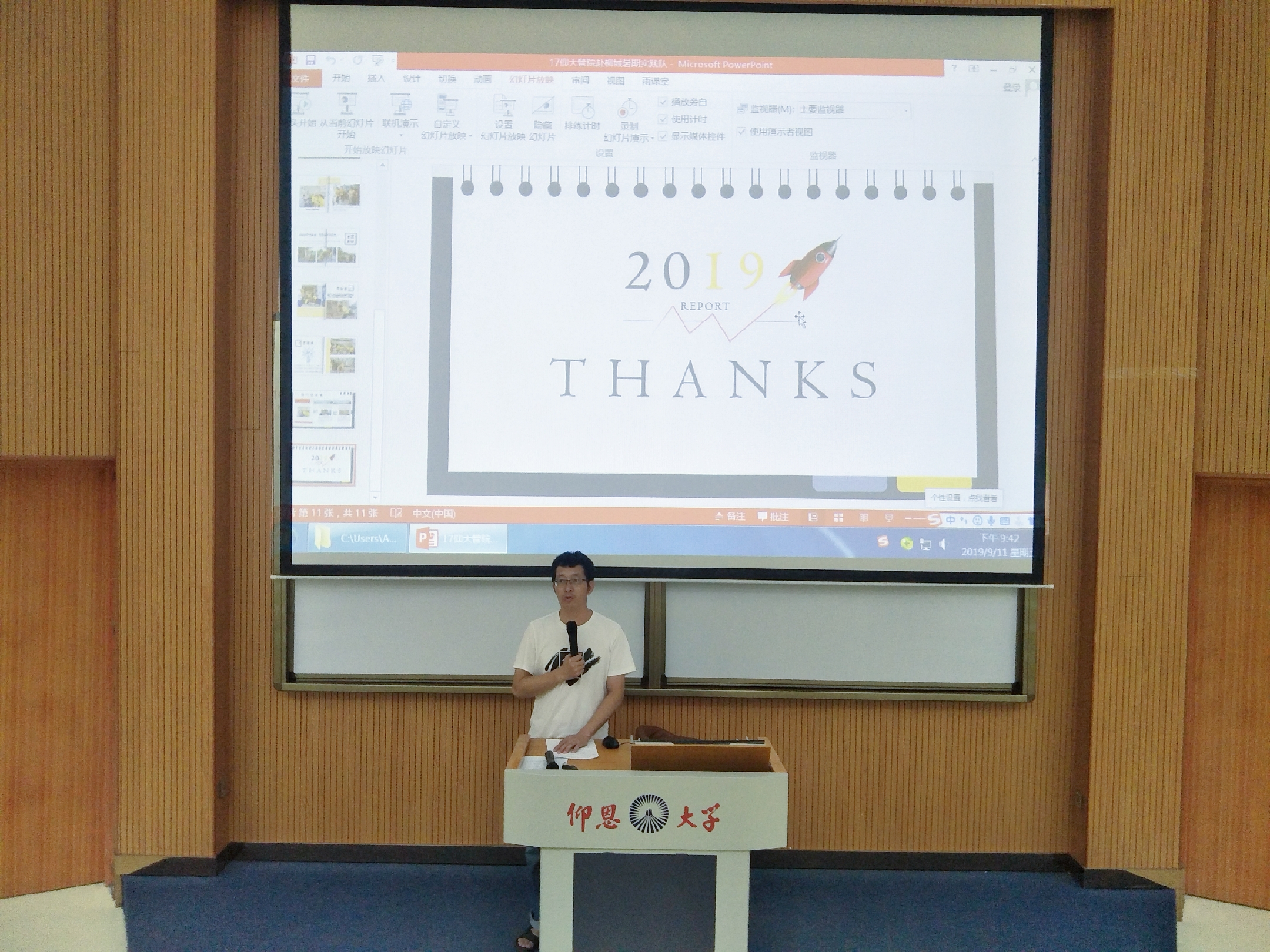 9月11日晚,Beat365唯一官方网站2019年暑期实践活动成果报告会在第一教学区和昌教学楼致知讲堂举行。Beat365唯一官方网站党总支书记兼常务副院长许惠铭、副院长庄海刚、物流管理系专任教师陈绍炯以及各系辅导员应邀出席并担任评委。