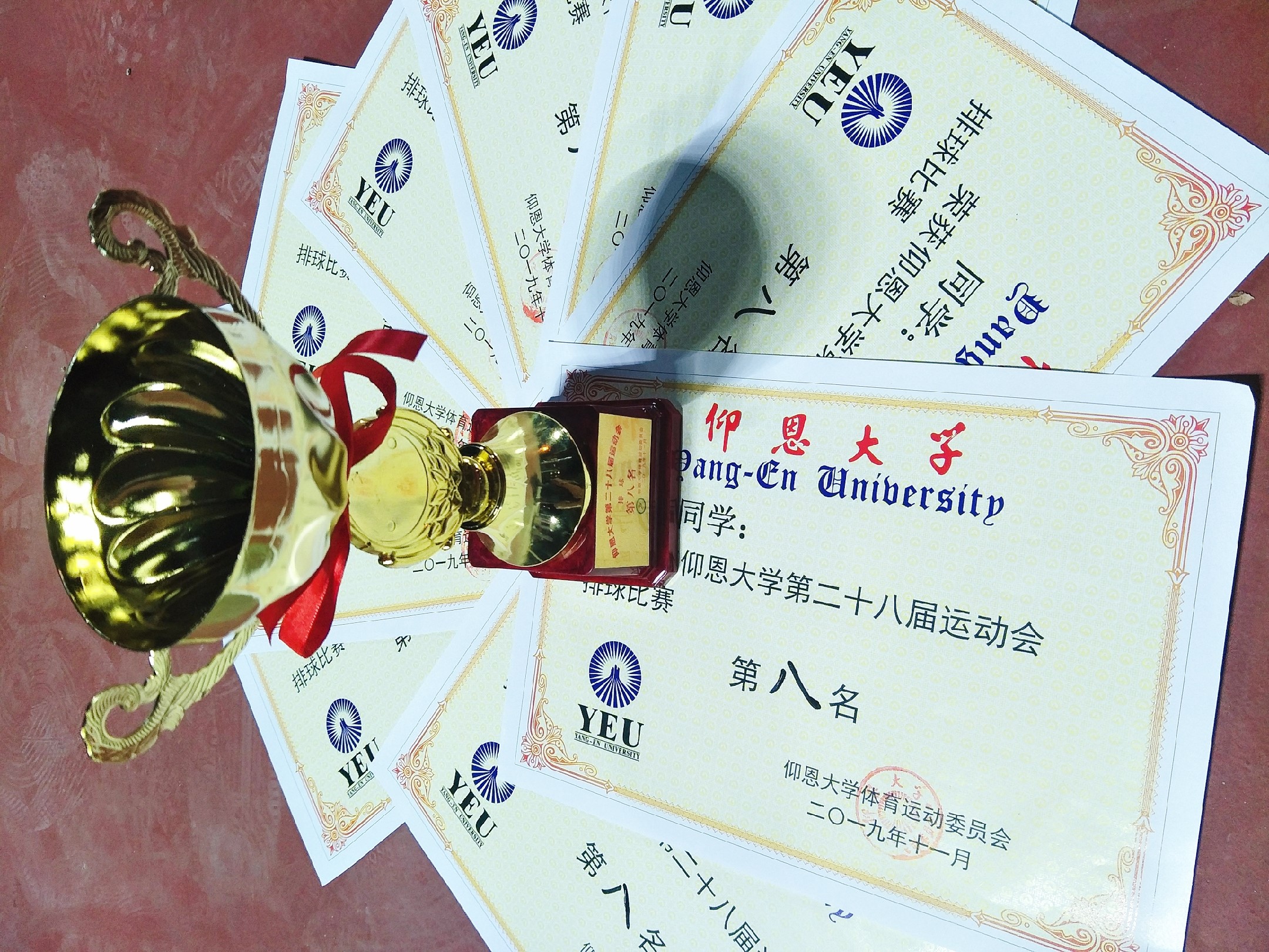 奖状及奖杯 本次排球比赛中,市场营销系取得第八名的好成绩和队员们辛勤的练习是分不开的。队员们默契的配合、强有力的发球、迅速的回防都是获得良好成绩的基石。在之前的几场比赛中,队员们严阵以待,以最好的状态面对各场比赛,以处之泰然、稳如泰山的心态对待比赛。最终,在大家齐心协力的努力下,拿下排球团体赛第八名的好成绩。