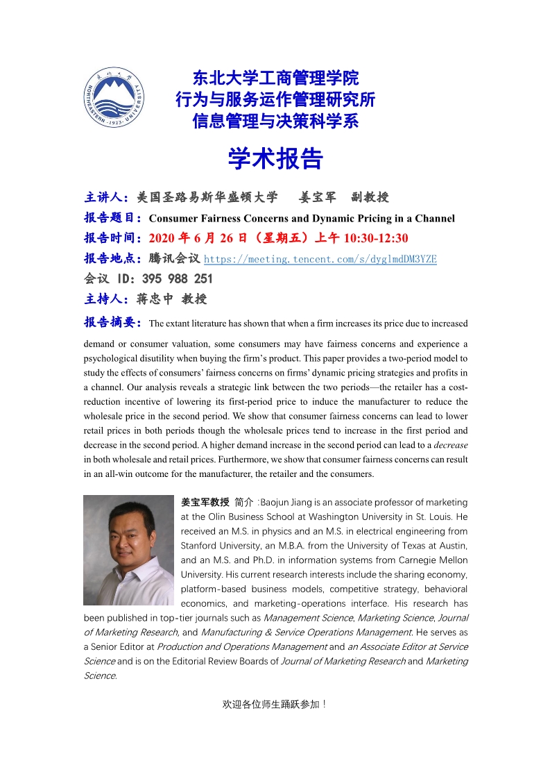 邀请美国圣路易斯华盛顿大学姜宝军副教授学术报告