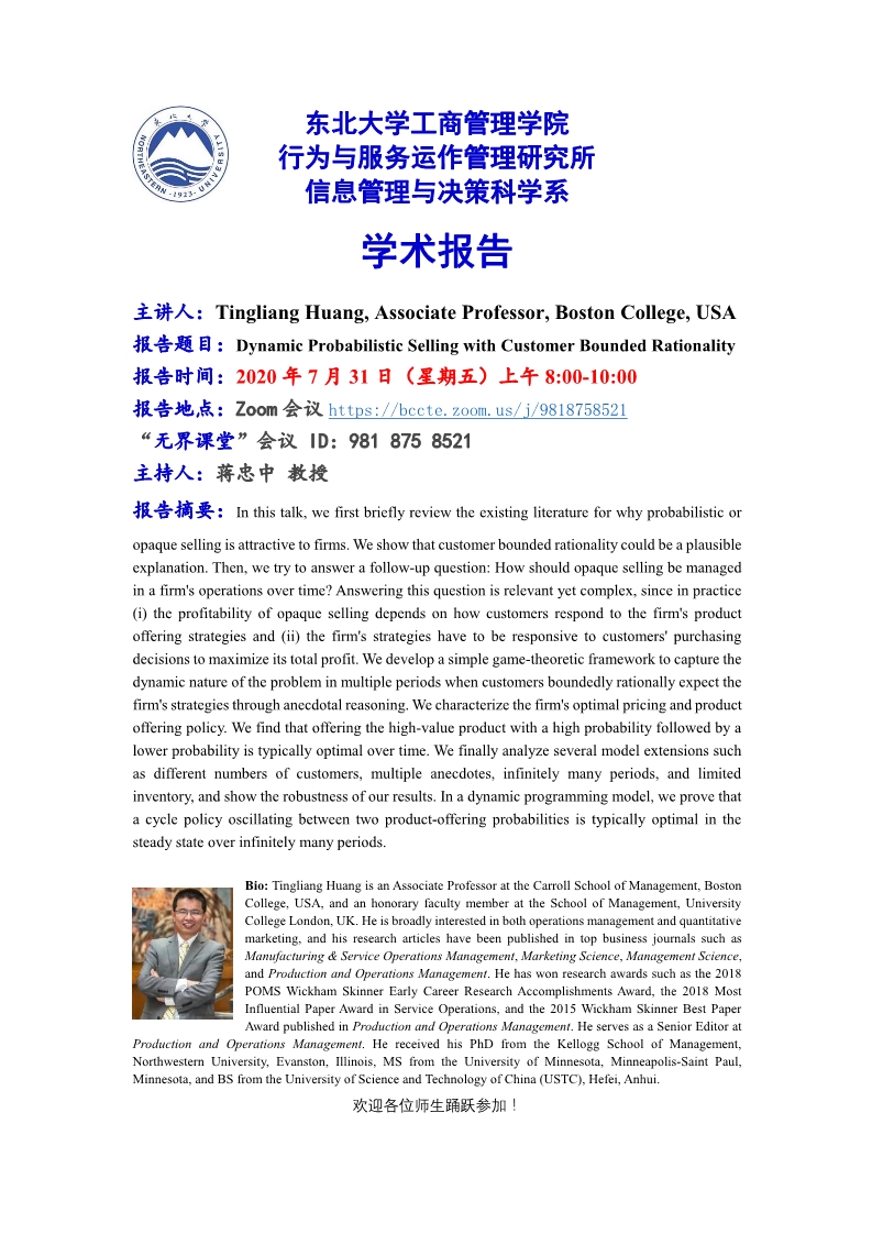 邀请美国波士顿学院卡罗尔管理学院黄廷亮副教授学术报告
