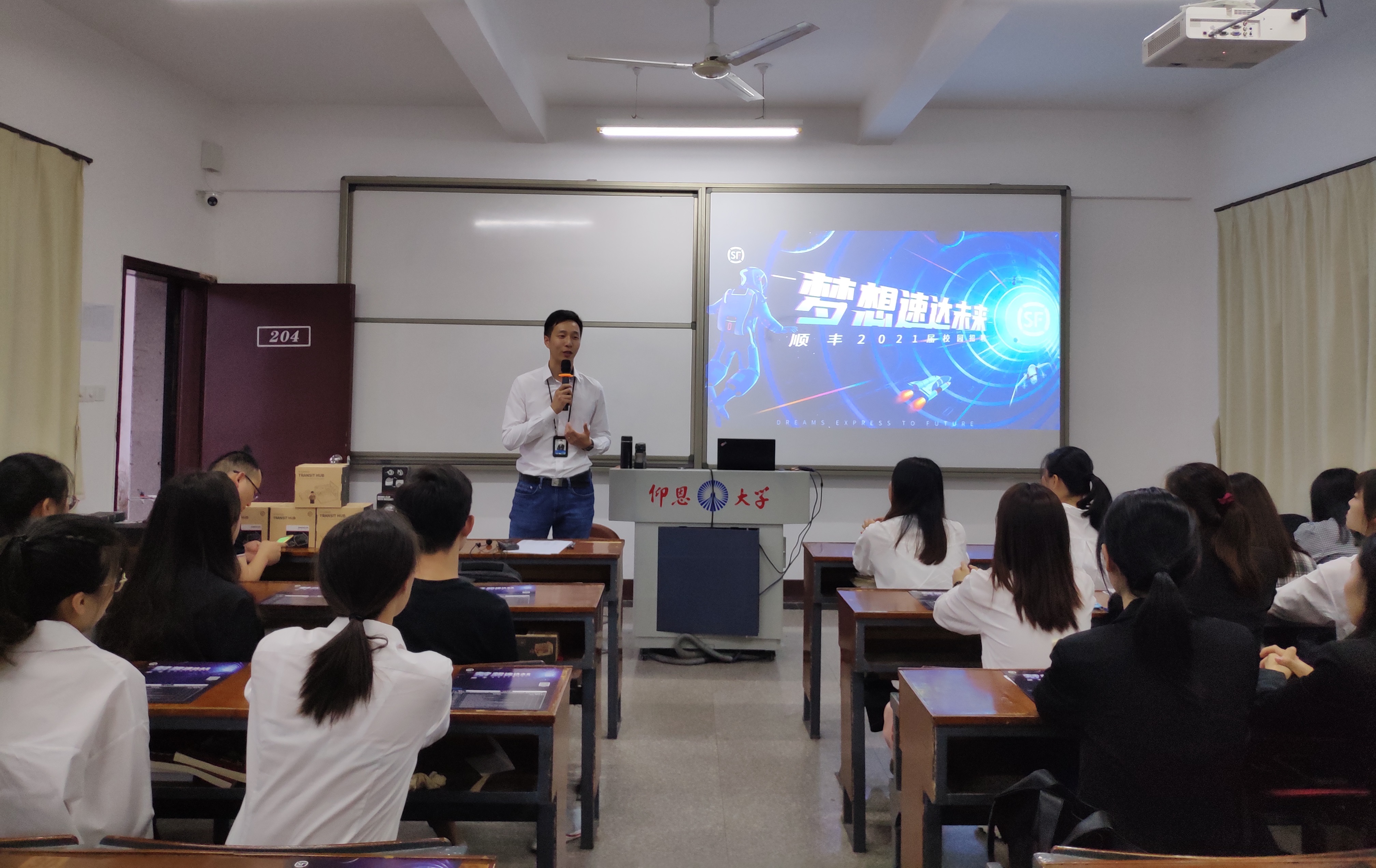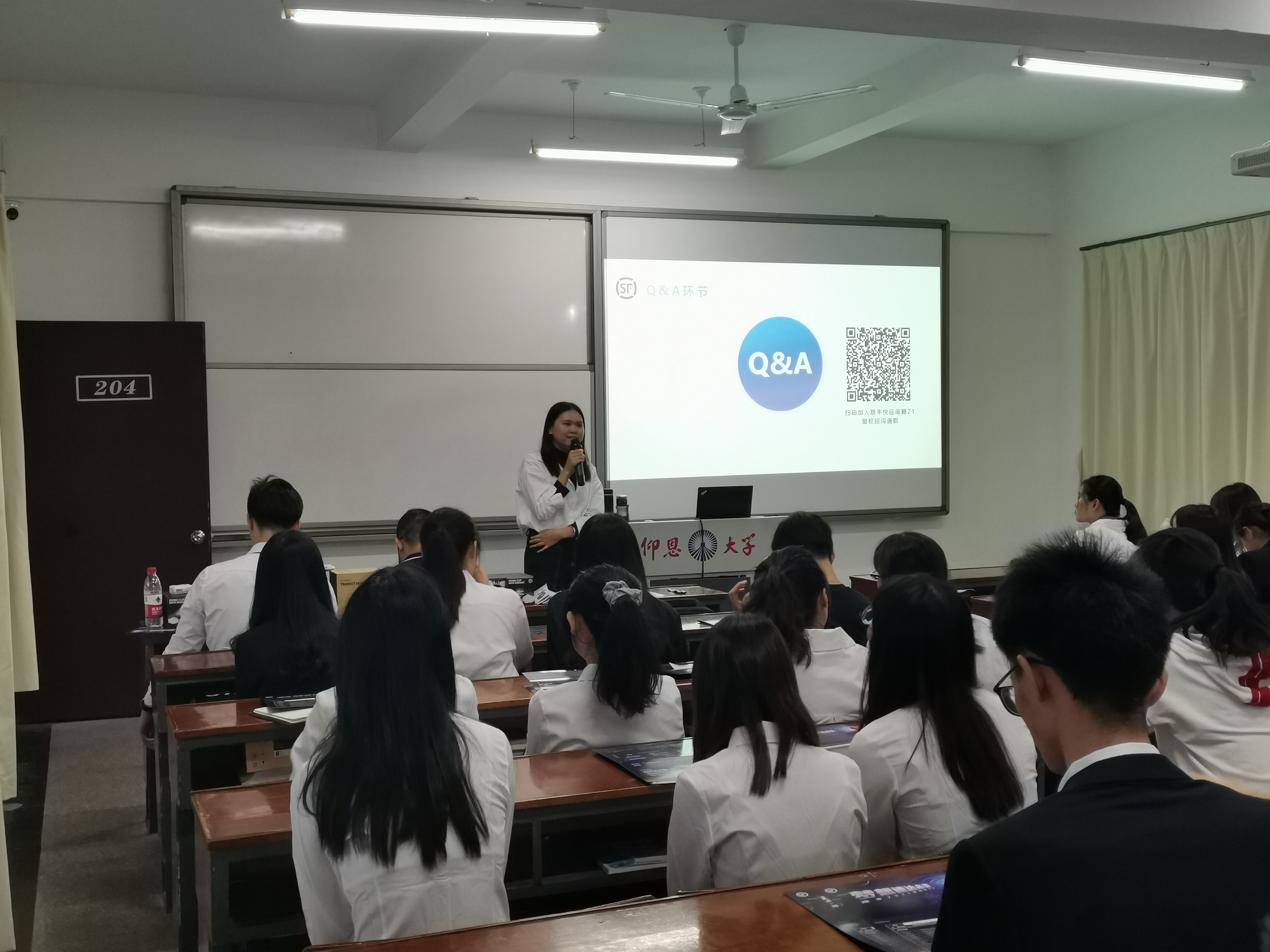 经验分享 招聘会伊始,负责人龙坤通过PPT演讲和视频播放的形式,向学生们介绍了顺丰企业的基本情况,提高了大家对顺丰企业的认识。同时,也为在场的应届毕业生们讲述了顺丰企业的就业岗位、工作要求、员工的发展渠道和薪酬福利等相关内容。接着,由刚毕业入职的学姐分享自己进入顺丰企业的感受和体验,给同学们传递顺丰的企业文化和人文关怀。宣讲会尾声,负责人龙坤给同学们答疑解惑,为同学们具体解释了应聘实习的具体流程、岗位的流动、实习考核要求等问题并对提问的同学发放顺丰小礼品。