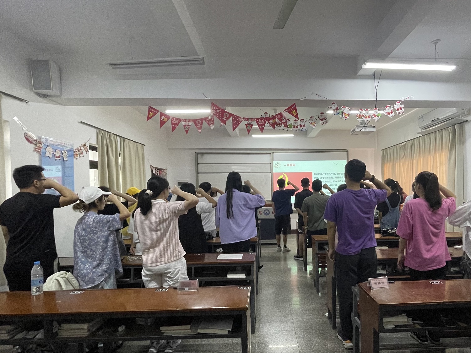 全体党员进行宣誓 大会伊始,支部书记冯瀚霄首先说明了大会目的和内容,向大家简要介绍了会议的流程。其次,陈美美、郑梦然等13名发展对象逐一汇报个人情况,并向党组织汇报自身对党的认识、入党动机、个人经历以及在校表现等。随后支部书记冯瀚霄同志向大会报告其现实表现的考察情况以及综合政治审查情况,与会党员对发展对象是否符合党员条件发表了意见。大会认为,陈美美、郑梦然等13名同志基本符合党员条件,经与会正式党员投票表决,大会一致同意接收陈美美、郑梦然等13名同志成为中共预备党员。
