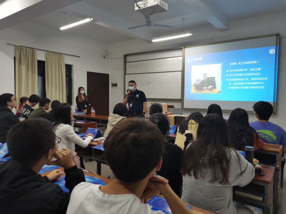 学长乐榕彬上台分享 宣讲会伊始顺丰主管郭小军为大家简单介绍了公司的基本信息、企业文化及2022届校园招聘的概况,让同学们更加了解顺丰这家公司。在接下来的有奖竞猜环节中,同学们也踊跃参与,积极回答。随后便是两位在顺丰就职的优秀学长乐熔彬和陈家伟就自身经验与感受进行分享,让我们感受到了不一样的顺丰文化与温度。宣讲会接近尾声,泉州区和东南分拨区的两位主管对校招岗位进行解答介绍,让同学们找到更适合自己的岗位。宣讲会结束后,顺丰在该教室进行了初试,每位应聘者脸上都写满了期待与紧张。