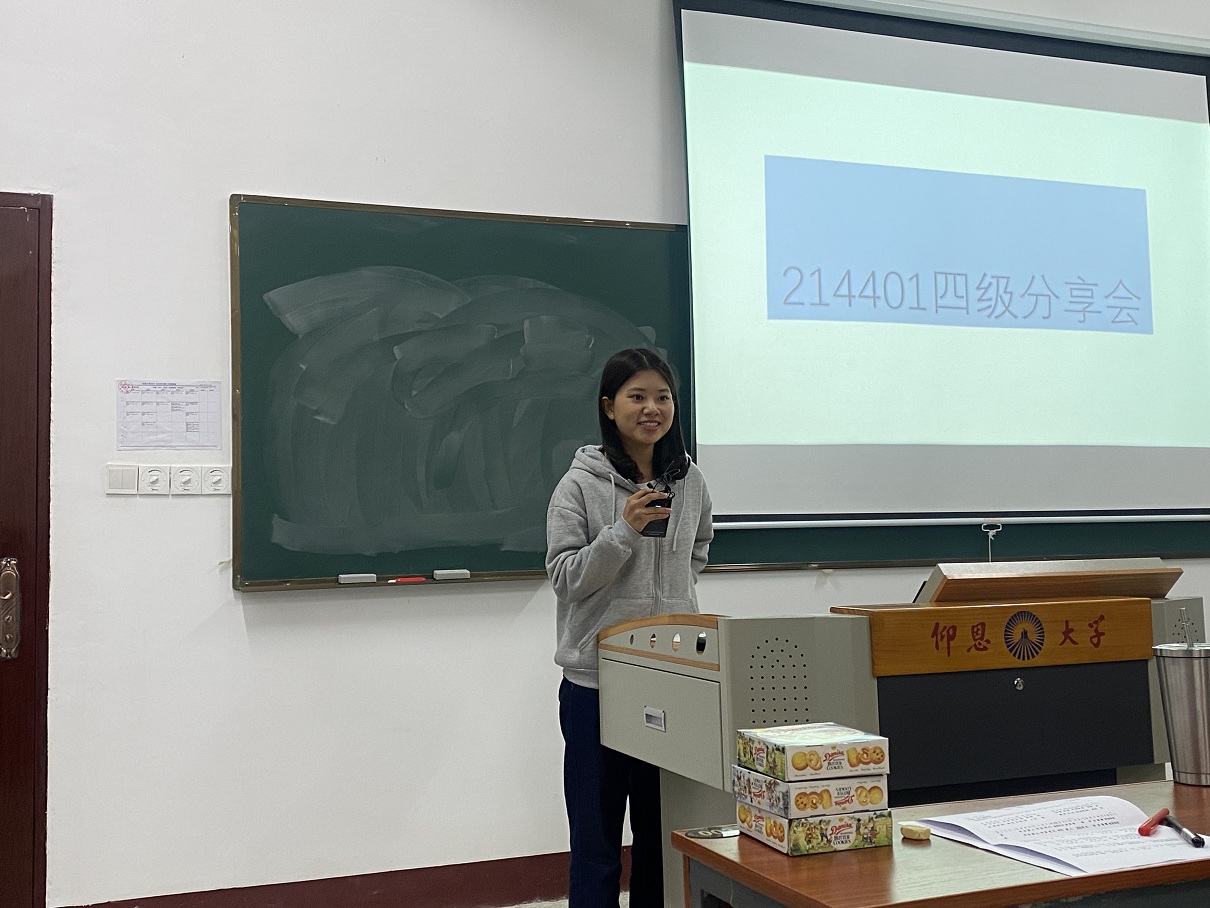 现场讲述 分享会伊始,辅导员助理为大一学生详细介绍了大学生英语四级考试的具体要求,包括题型设置、详细时间、相对应的流程、考生操作内容及考生须知,有针对性地为同学指明了应对四级考试的策略,使同学们对其有了更深入的了解。然后,由19、20级以及21级各班通过四级考试的同学进行分享自己的备战方法与经验,以及考场上的答题策略与应急处理方式,做到“正确调整心态”和“合理安排时间”,同时应尽早主备,一步步积累。最后大一学生针对自己存在的疑虑与困惑向学生代表进行提问,学生代表们也慷慨解囊,为大一学生答疑解惑,并提供了有效建议。