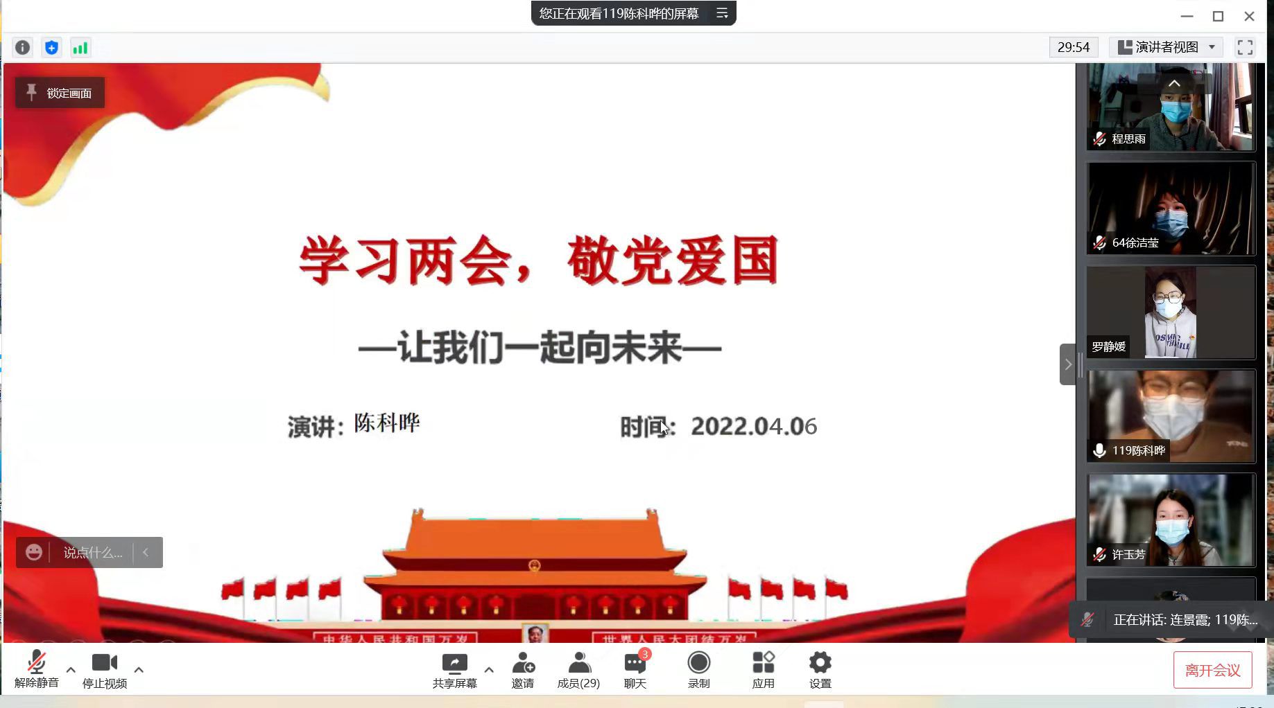 4月6日下午,市场营销系学生党支部在腾讯视频召开线上主题“学习两会,敬党爱国”党课学习,本次活动由陈科晔同志主讲,全体党员参加。