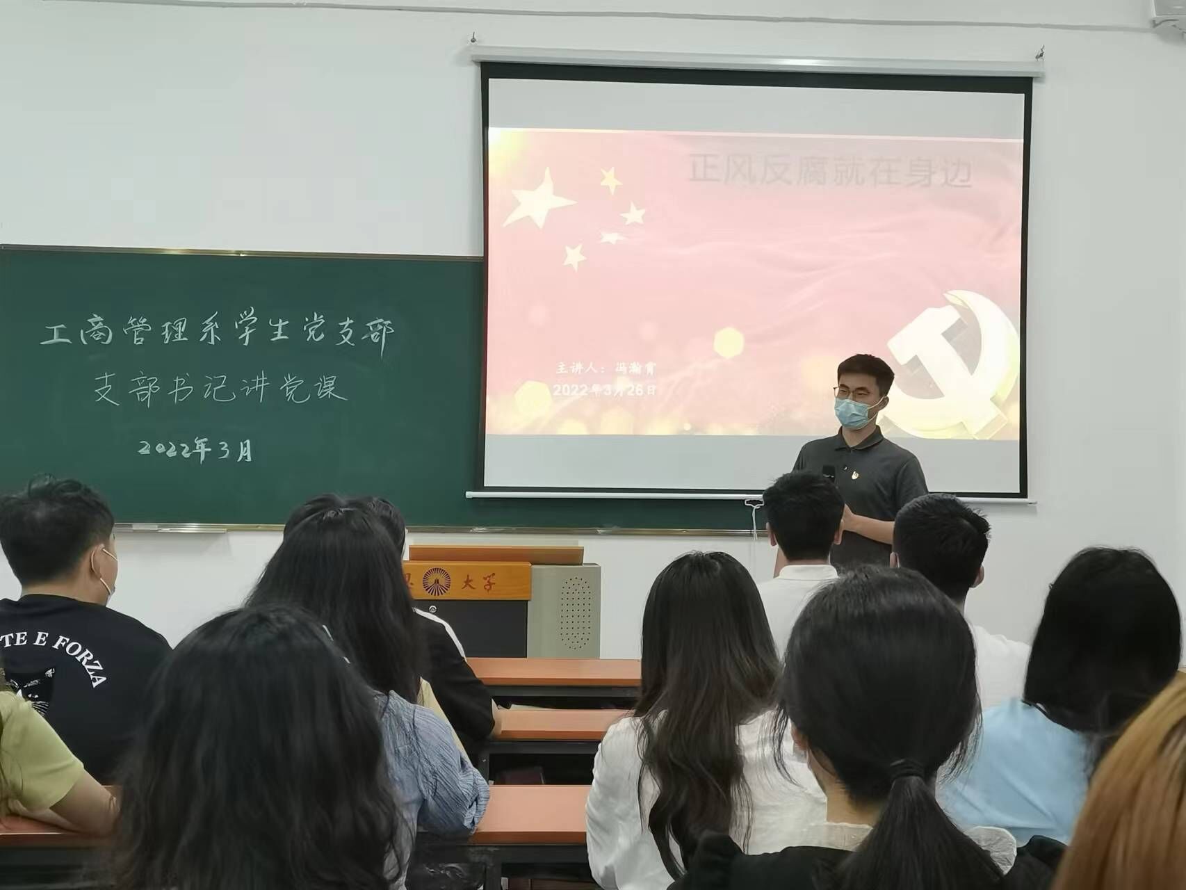 为进一步提升学生党员的理想信念,坚定学生党员的政治站位,加强学习型党组织建设,切实发挥党员教师的先锋模范作用,工商管理系学生党支部于2022年4月27日在祥贤楼101室开展党课学习。支部书记冯瀚霄同志以《正风反腐就在身边》为主题,为全体党员上了一堂具有高度理论性和针对性的专题党课。
