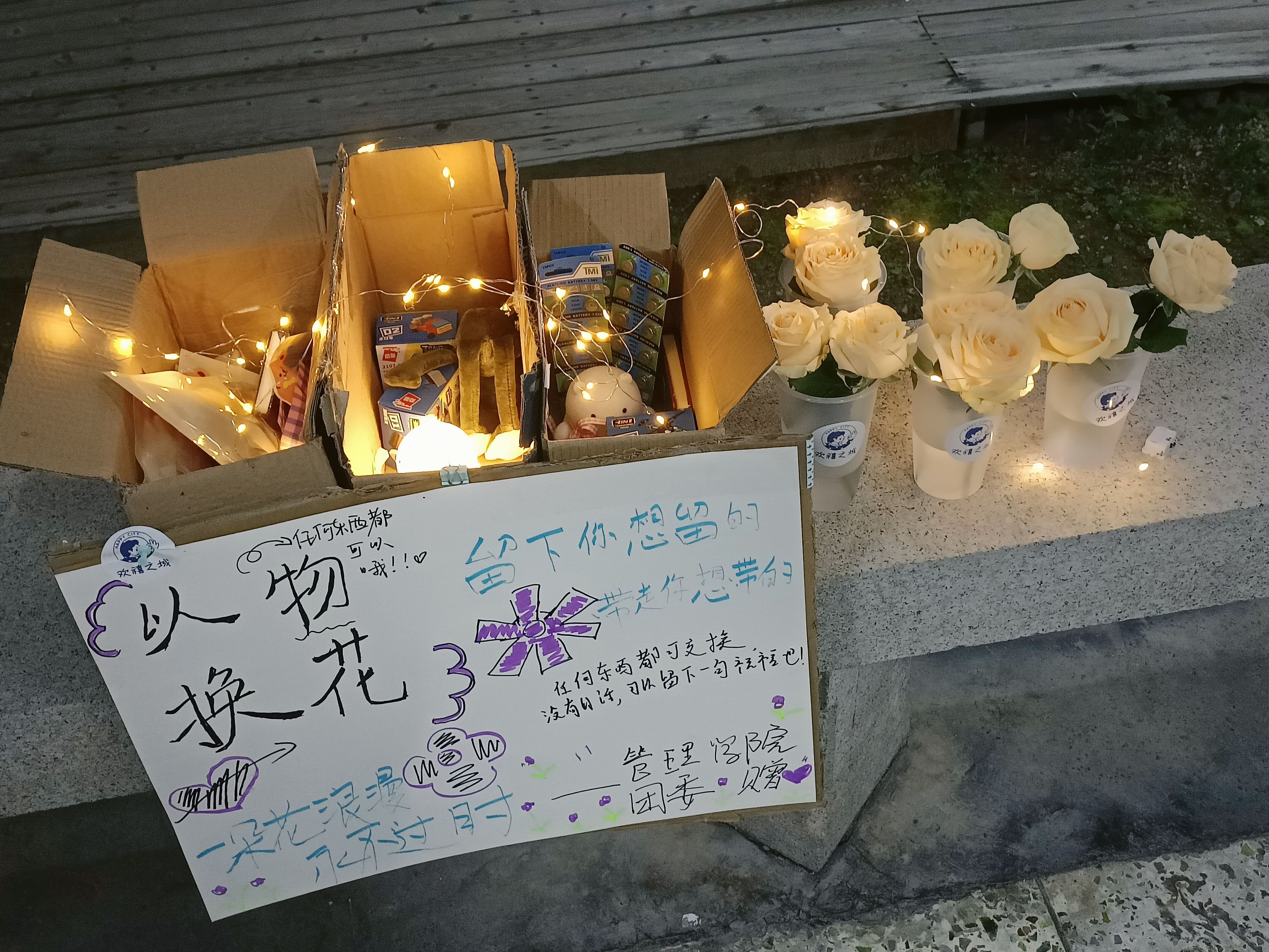 活动图片 该活动秉持自由交换的原则,同学们可用零食、发卡、玩偶、文具等各种物品来换取一朵鲜花或其他物品。桌上的鲜花随着流动的人群流向各处,交换箱中的小物品及各位同学留下对毕业生的寄语则叠的越来越高。以物换花,换你欢喜,带走鲜花的同学得到的不仅是一朵花,也是一整天的好心情。浪漫是会传递的,留下你想留下的,带走你想带走的,愿我们都有数不尽的浪漫与美好的鲜花。