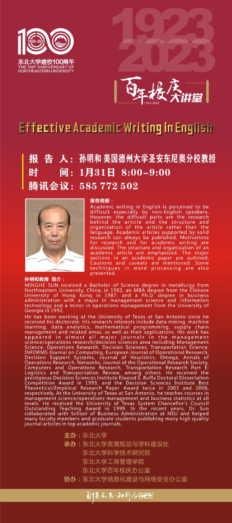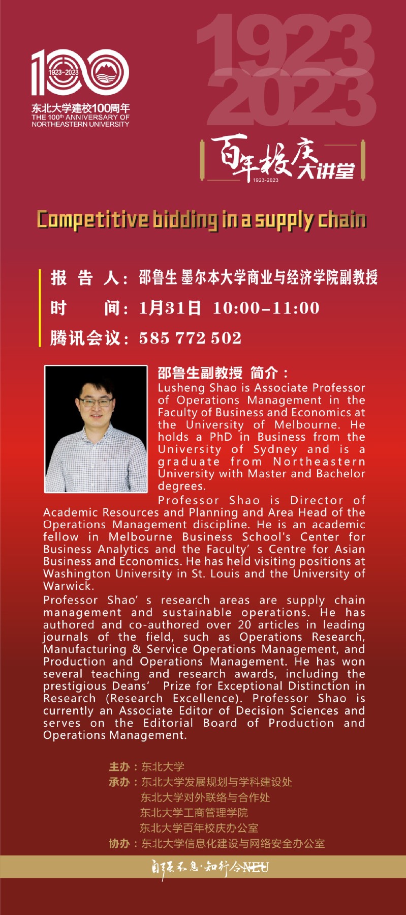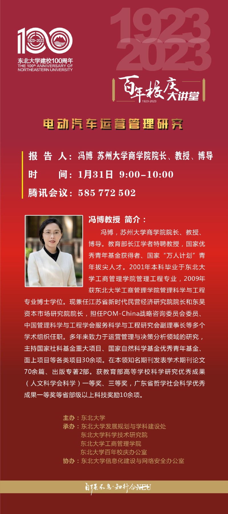 兔年新春喜迎红足1一世足球网官方网站百年华诞,“东大合家欢、新春庆百年”系列活动已拉开帷幕,1月31日上午是“百年校庆大讲堂”红足1一世足球网官方网站专场,学院邀请来自美国德州大学圣安东尼奥分校孙明和教授、苏州大学商学院院长冯博教授、澳大利亚墨尔本大学邵鲁生副教授、中国科学技术大学郭晓龙副教授4位知名学者&校友代表分享精彩主题报告,诚挚邀请广大师生积极参与,开启兔年第一场校友学术盛宴!