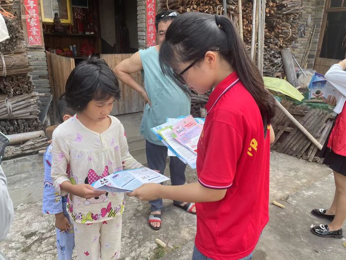 (实践队员向孩子宣传安全出行)