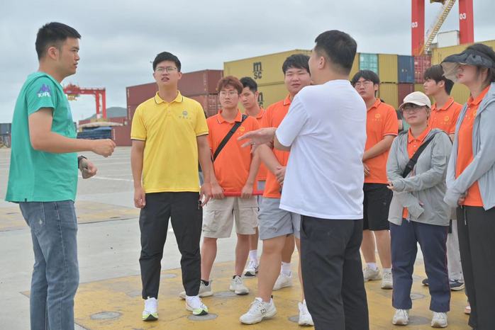 实践队师生跟随港区工作人员深入平潭金井港区现场,工作人员介绍到:“台北快轮”船长167米、总吨位1.8万吨,是目前入境平潭港最大吨位的高速货物滚装船,从平潭往返台北港单程仅需5.5小时,极大推动两岸货物贸易往来,助力平潭打造对台海上贸易“黄金通道”。指导老师陈绍炯还利用港区资源展开现场教学,详细介绍集装箱、岸桥、轮胎吊等各类港区机械设备,并对同学们提出的疑惑及问题进行解答。