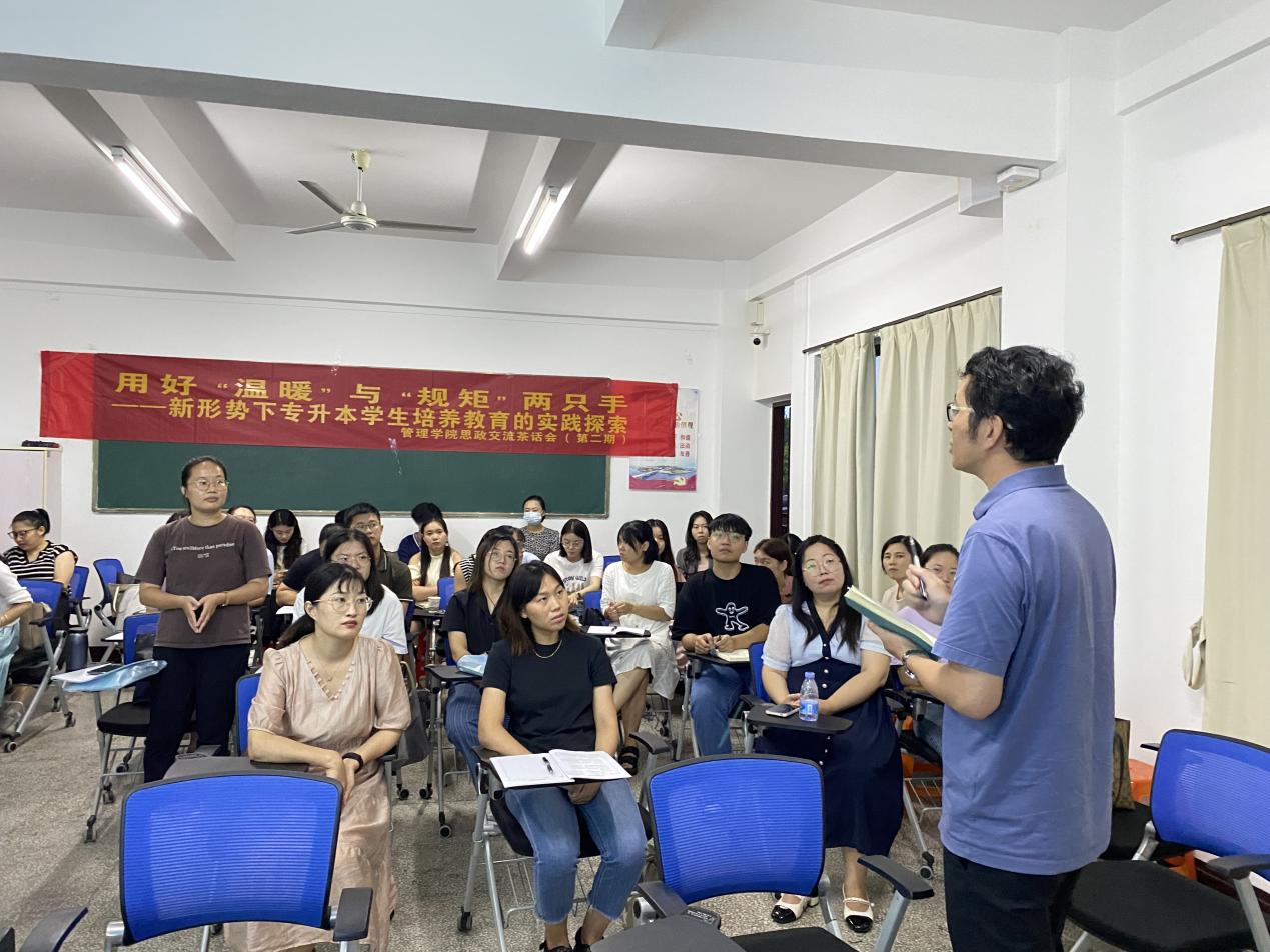为进一步提高Beat365唯一官方网站专升本学生思政工作水平和质量,完善学院全员育人工作格局。9月11日下午,Beat365唯一官方网站在吉龙楼208举办第二期学院思政交流茶话会,聚焦学院专升本学生的思想政治教育工作。活动由党总支书记兼常务副院长许惠铭主持,辅导员连景霞、班主任许勇分别进行主题分享,全院班主任、辅导员老师参加活动。