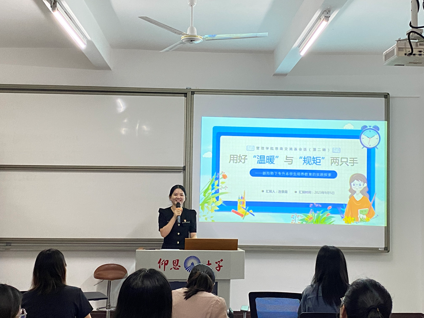 连景霞老师结合多年的工作实践,归纳了专升本学生的七个特点,分享了个人在工作中如何利用关爱温暖学生、用规矩优化管理,开展四项教育,从而有效提升专升本学生的思想政治教育工作水平,让在场的辅导员和班主任深受启发。