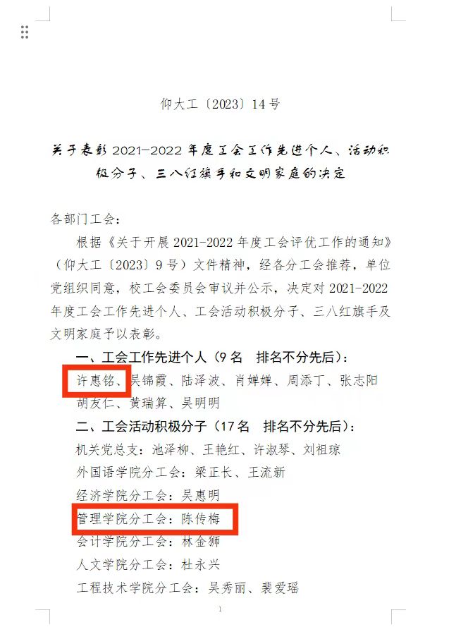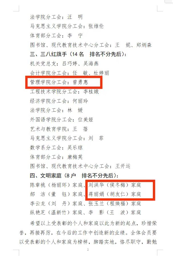 9月8日,校工会对过去一年在工会工作中做出突出贡献的教职工进行了表彰,我院许惠铭老师获工会工作先进个人、陈传梅老师获工会活动积极分子、曾勇惠老师获三八红旗手、刘洪华(侯冬梅)家庭、蒋丽娟(胡友仁)家庭获文明家庭荣誉称号。获表彰的老师们表示,他们将以此为新的起点,珍惜荣誉,再接再厉,在今后的工作中创造新的业绩!