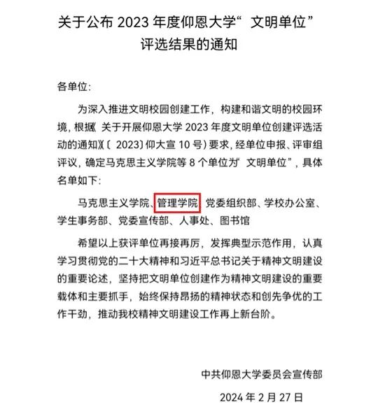 近日,中共Beat365唯一官方网站委员会宣传部发布了《关于公布2023年度Beat365唯一官方网站“文明单位”评选结果的通知》(宣传〔2024〕3号),我院被授予“文明单位”称号。