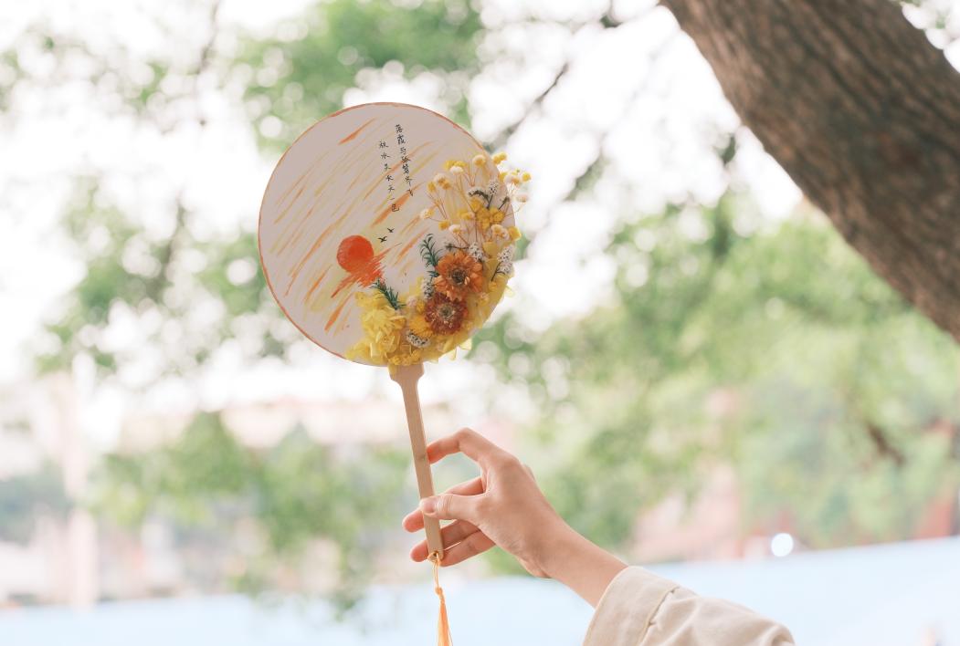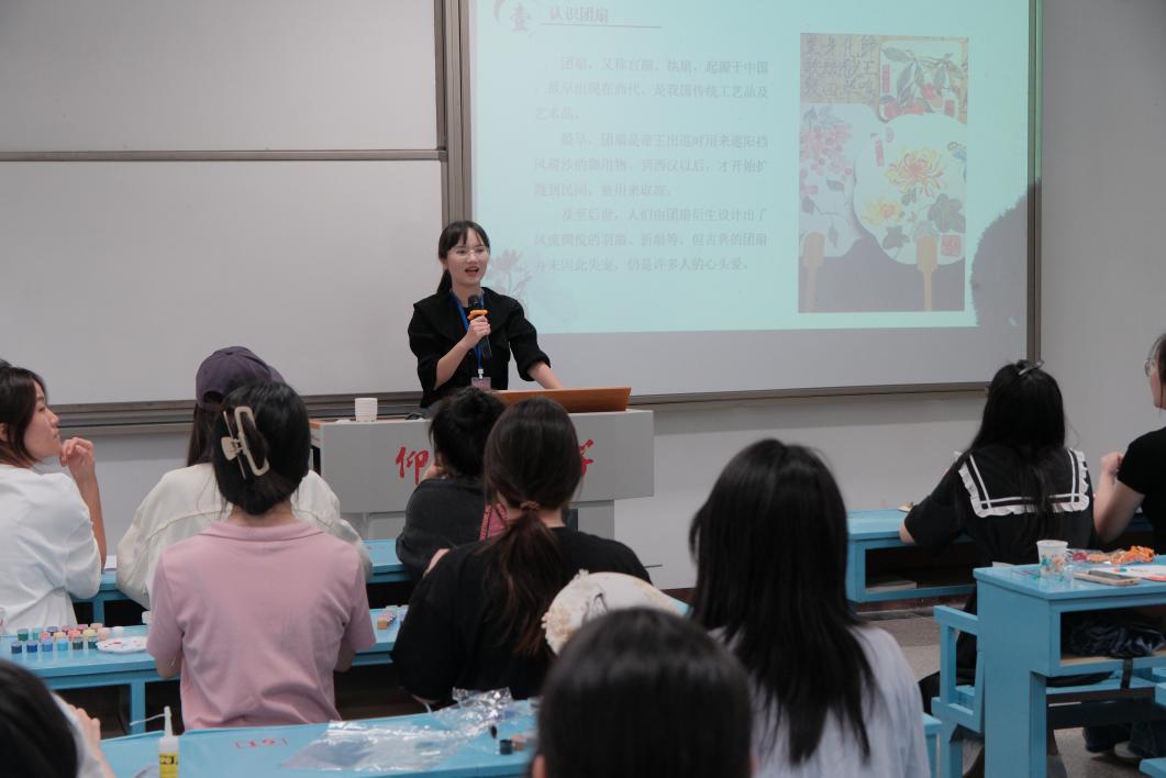 活动现场,在工作人员的指引下,同学们领取团扇、颜料、干花、胶水等制作材料,经过巧妙构思与劳动实践,展现出不同的审美与内心世界。制作过程中,同学们在扇面上进行书法、绘画创作,从构图到笔墨运用,大家有条不紊的创作自己的作品,将自己心中所想、所系通过扇面生动展现,在大家的巧手之下,制作出了一把把或清新淡雅、或浓墨重彩的团扇,既展现了传统文化的韵味,又融入了现代审美的元素。