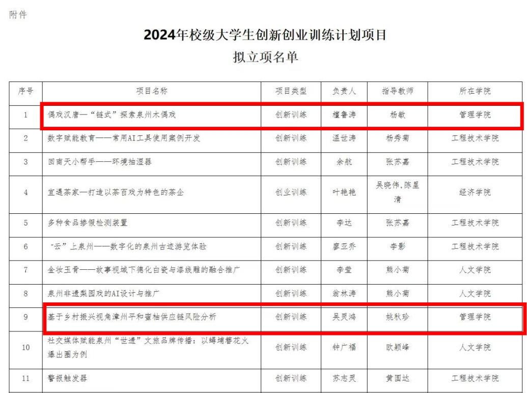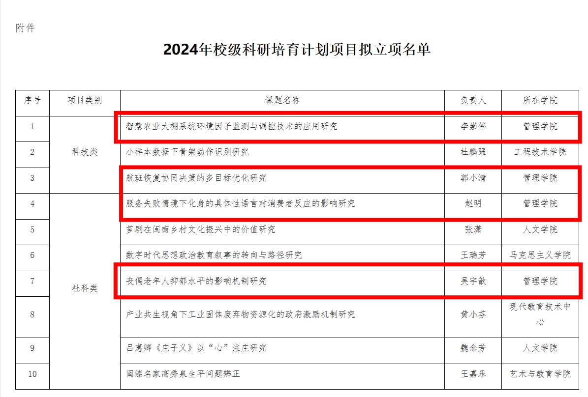 近日,学校公布了2024年校级科研培育计划项目拟立项名单、2024年校级教育教学研究课题拟立项名单、2024年校级大学生创新创业训练计划项目拟立项名单,我院总共拟立项18项,其中校级科研培育计划项目4项、校级教育教学研究课题2项、校级大学生创新创业训练计划项目12项。