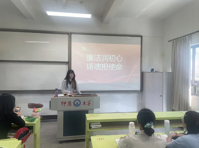 会议伊始,颜瑜铃同志以PPT的形式向同学们讲述了如何真正将廉洁二字落实、贯穿到我们的生活中,学习中,工作中。如何有效的去扩大这份感染力。随着社会的发展和进步,廉洁、诚信的意识和意义变得越来越重要。作为一名公民,我们必须坚持廉洁正直的原则,铸造自己的灵魂。