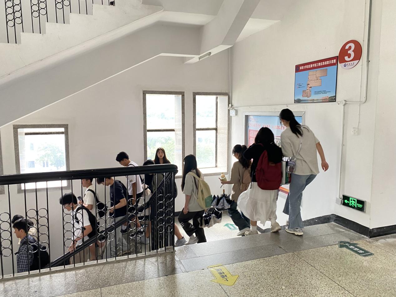 在演习开始前,同学们先在实验室旧图301模拟上课,当预定的铃声响起时,同学们迅速按照火灾逃生的标准规范行动,他们用衣物或手紧紧地捂住口鼻,以保持呼吸道的通畅,并弯腰低头,沿着指定的疏散通道有序撤离。与此同时,我院的老师们在三楼及以下楼层负责维护秩序,引导学生进行疏散,防止意外事故的发生。