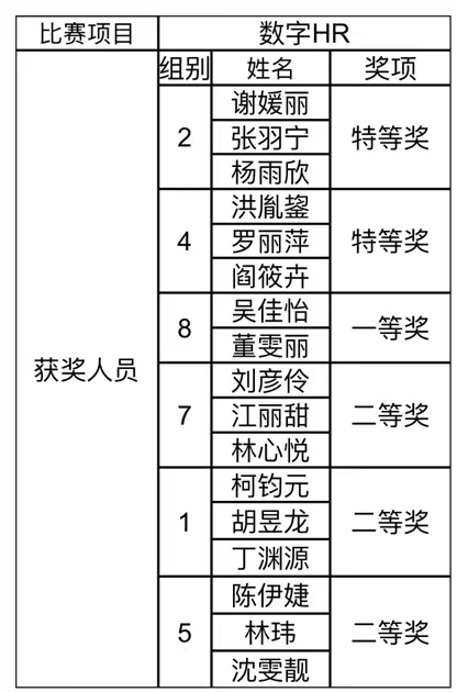 经过激烈角逐,实务设计、数字HR赛道共6支队伍获奖;案例分析赛道共谢诗妍、江欣豪等13位同学获奖;劳动争议处理赛道共林丹云、谢媛丽等6位同学获奖;职场实战赛道共何佳欢、范灵璇等12位同学获奖;无领导小组讨论共李琳、杨子怡、张倩等15位同学获奖。