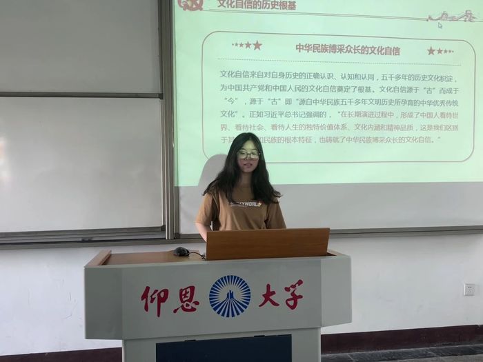 紧接着该同志讲述了文化自信的历史担当。当今时代,中国共产党肩负着复兴中华文化、让历史上的中国重新焕发生机与活力的历史重任。习近平总书记强调的“没有高度的文化自信,没有文化的繁荣兴盛,就没有中华民族伟大复兴”,诠释了中华文化复兴和中华民族伟大复兴相互融通、内在一致。