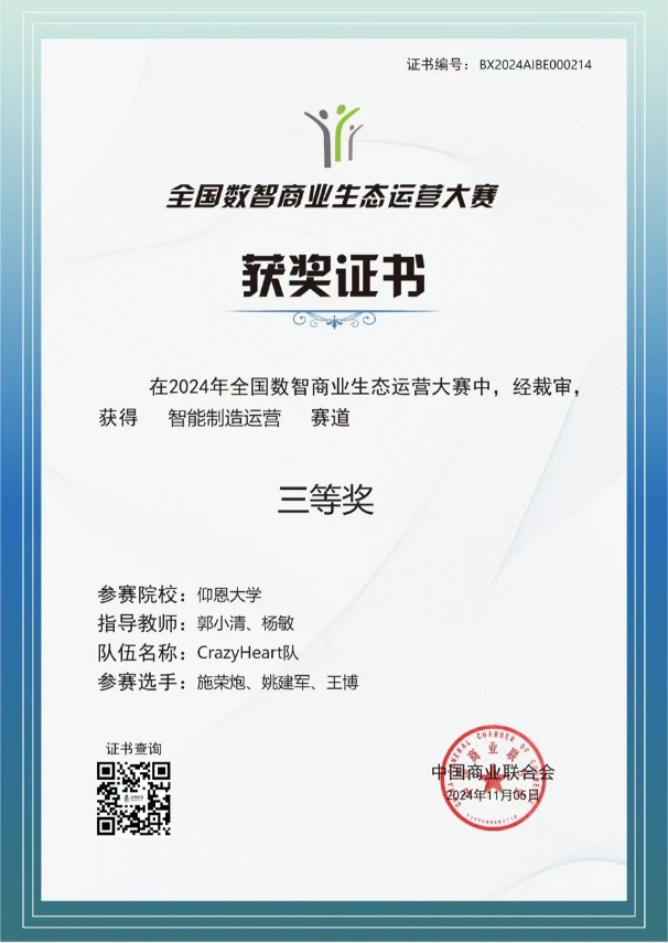 本次大赛锻炼了学生的团队合作能力和创新应用能力,提高了学生的逻辑思维能力和分析能力。通过参加比赛,我们实现了“以赛促学、以赛促训”的目标,进一步激发了学生的数字思维和数字意识,锻炼了学生的实践能力,营造了良好的学术氛围,促进了人才培养质量的不断提高。