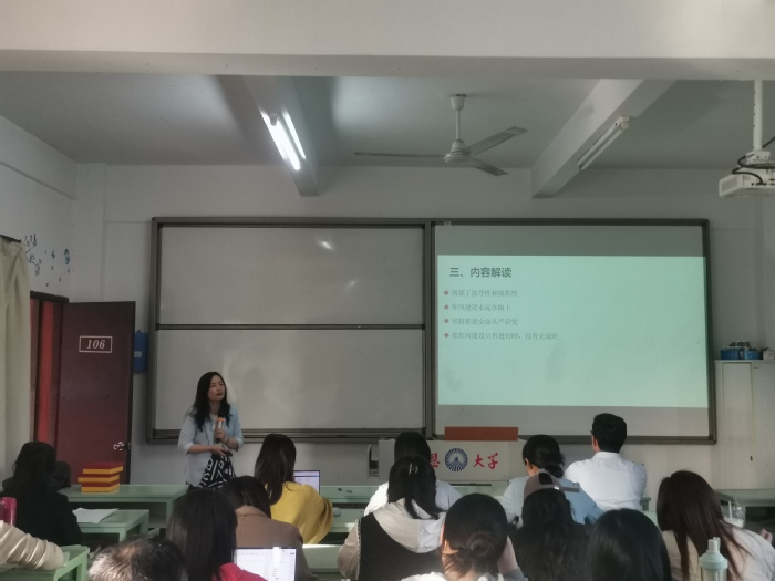 会上,程春同志系统讲述了中央八项规定的历史背景、核心内容与实践要求。从2012年八项规定出台的时代背景切入,详细解读了改进调查研究、精简会议活动、规范出访活动等具体条款,并结合高校教师工作实际做进一步内容解读,强调“杜绝形式主义、厉行勤俭节约”的重要性,要求全体党员将纪律要求内化为思想自觉与行动自觉。
