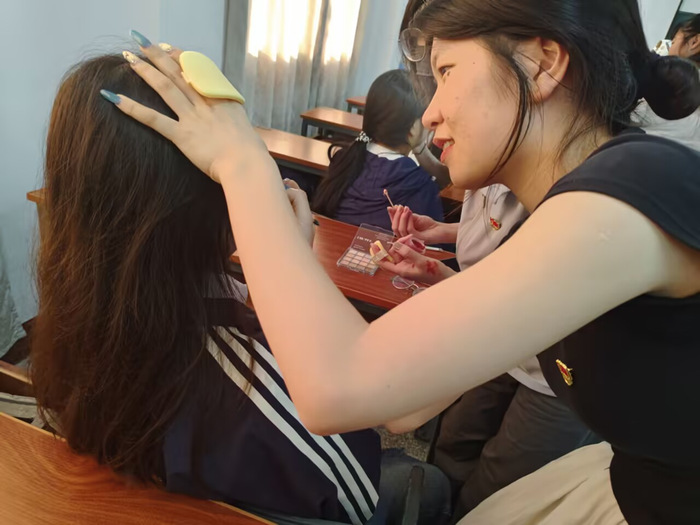同志们抵达指定场地后立即进入工作状态。在讲台前,大家有序完成物资分拣与任务布置,随后根据分组快速展开工作流程——从底妆修饰到五官的描绘,尽力为每位合唱队员打造契合舞台的精致妆容,助力五四精神的青春风采在聚光灯下完美绽放。