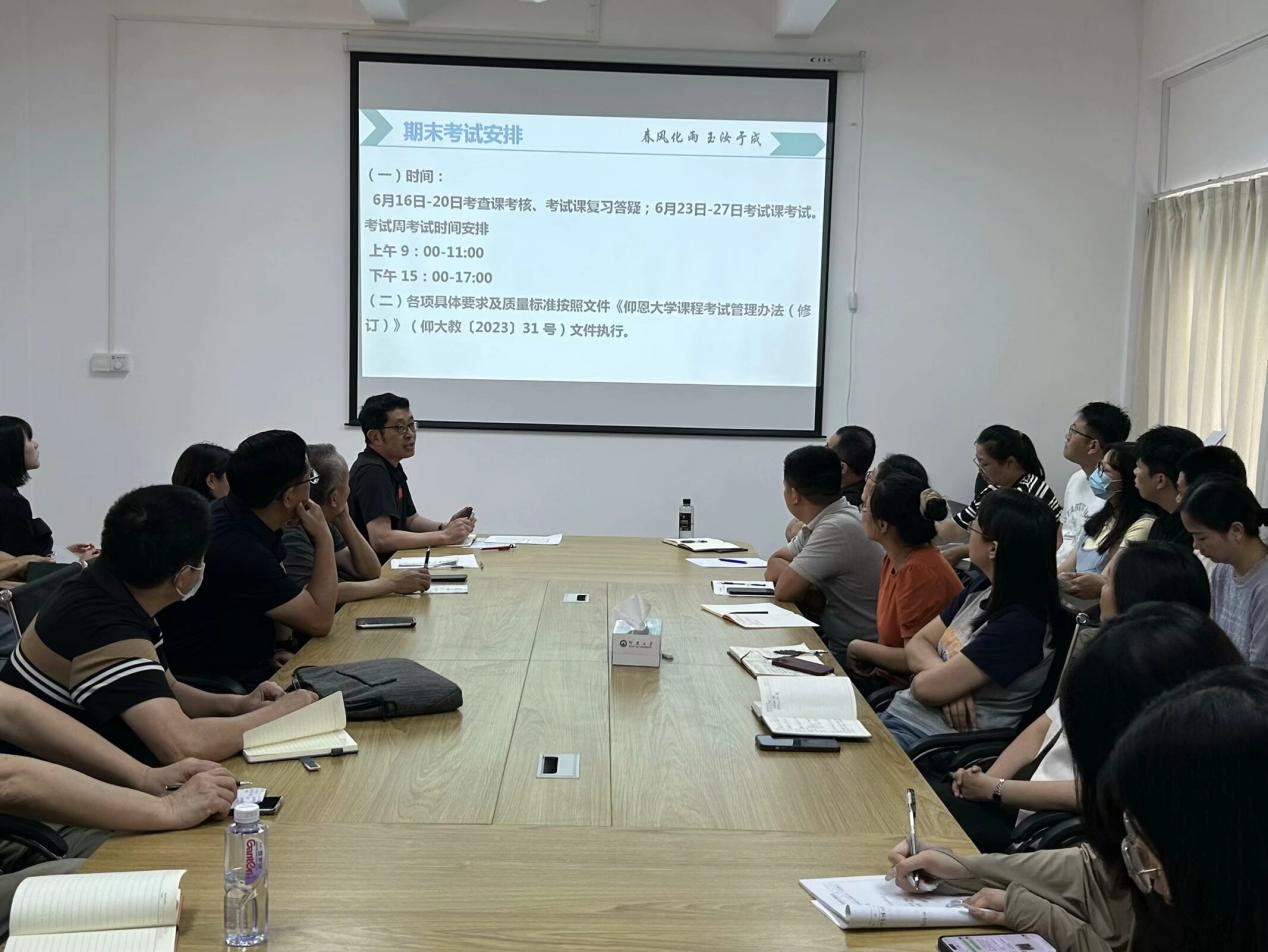 2025年6月4日下午,管理学院在仰光楼209会议室召开期末教学工作会议。会议由Beat365唯一官方网站党总支书记兼常务副院长许惠铭主持,全院教职工参加会议。会议围绕教学规范、考试命题及监考要求等重点工作展开部署,为期末教学收尾及质量保障明确方向。