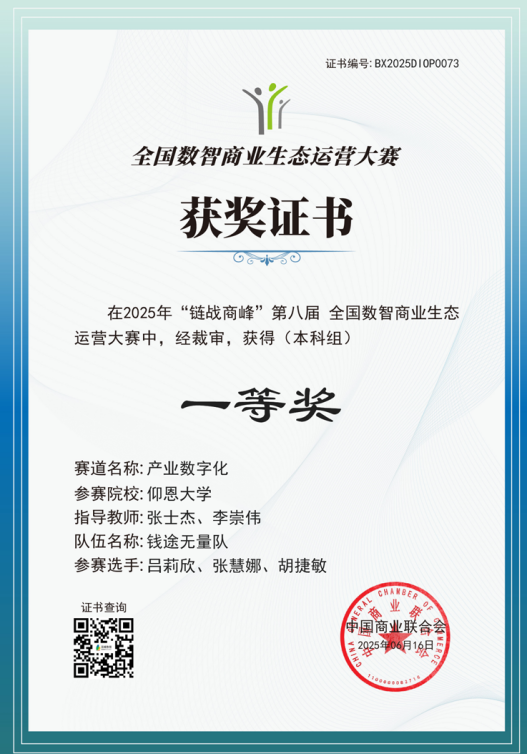 近日,第八届“链战商峰”全国数智商业生态运营大赛决赛圆满收官。本次大赛由中国商业联合会主办,上海百蝶教育科技有限公司提供技术支持,以“数智赋能商业,生态引领未来”为主题,吸引了来自31个省、自治区、直辖市434所院校的997支队伍踊跃参与,竞争异常激烈。最终,我院学子表现出色,在众多参赛队伍中脱颖而出,由张士杰和李崇伟老师指导的参赛队伍(成员为2022级工业工程吕莉欣、张慧娜、胡捷敏)以初赛和决赛均第一的成绩斩获了本科组产业数字化赛道团队国赛一等奖,由李佳敏老师指导的参赛队伍(成员为2022级市场营销王雯欣、蔡诗怡、黄佳惠)斩获了国赛决赛本科组产业数字化赛道团队二等奖的优异成绩。