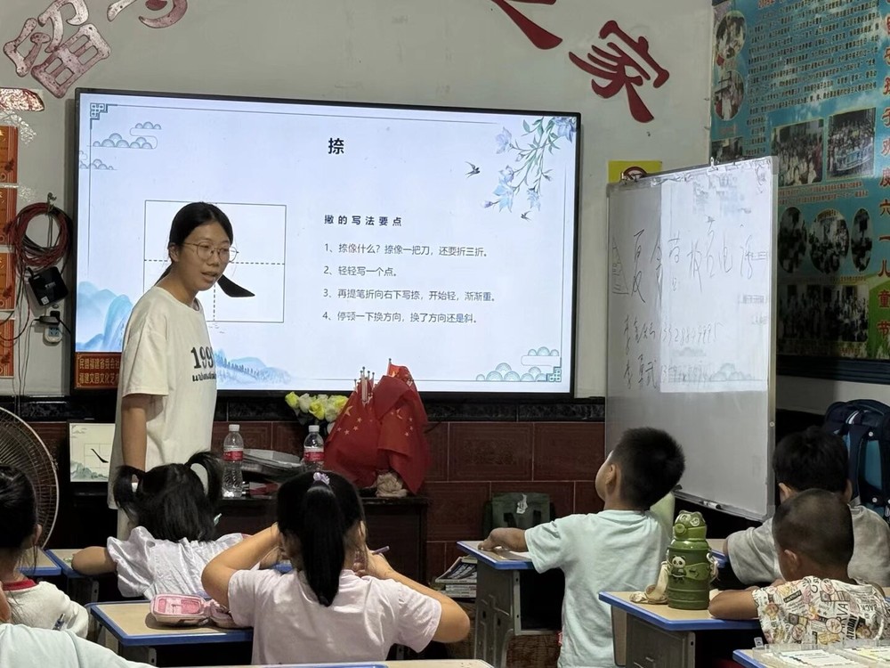 硬笔书法课堂亮点纷呈。队员余悦从基本笔画教起,队员们走到孩子们身边耐心指导。精心设计了一系列书法小游戏。“火眼金睛”环节,孩子们快速从众多文字中找出不同;“趣味猜谜”环节,大家根据提示开动脑筋;“笔画加减”“慧眼识字”“看图补笔画”等游戏,更是激发了孩子们的学习热情,孩子们积极踊跃回答问题。