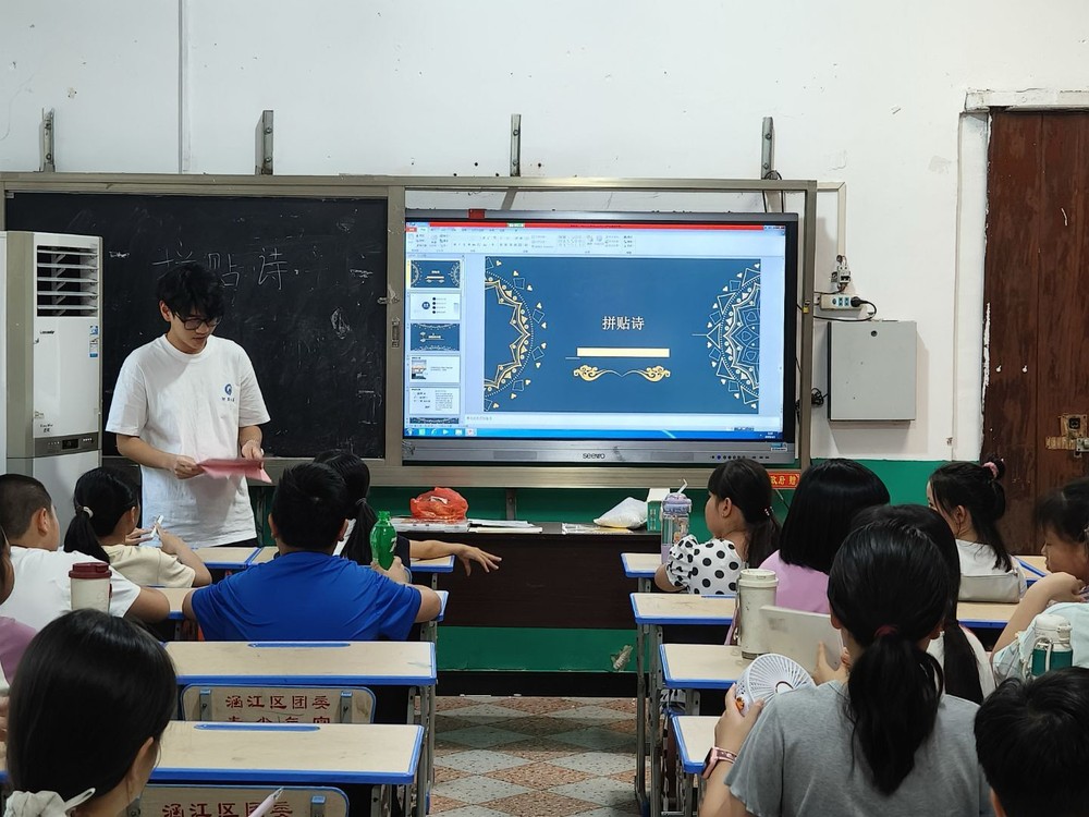 实践队员余志伟指导孩子们将印有词语的纸张进行裁剪和拼贴,完成诗歌创作。实践队员薛郑佳曼讲解“不织布手工”课程。孩子们使用老师提供的材料,在不织布上裁剪图案并完成拼贴作品,这有助于孩子们提高手部操作能力和注意力集中度。古法蓝晒课程中,孩子们跟着老师在涂有感光溶液的纸张上放置自然素材,经阳光照射后形成影像。这一过程展示了古典摄影技术的基本原理。