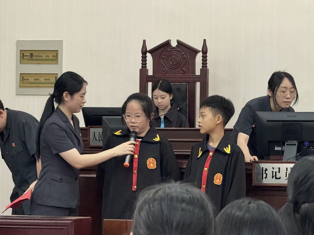 安检体验拉开活动序幕,孩子们在法警的讲解中体验法庭安检,更学练警务礼仪,初识规则与秩序。涵江区法院副院长林艳艳致辞,以温和话语点亮活动主旨。 法庭之内,涵江法院一锤落下,孩子们化身“法官”“律师”“书记员”等庭审角色,在沉浸式体验中熟悉法庭布局,明晰诉讼参与人职能,法治的庄严悄然植根心间。孩子们与嘉宾、工作人员共绘法韵画布,用色彩勾勒对法治的理解与向往。研学礼包的赠送,为这段旅程添上温暖注脚。