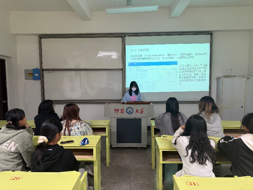 随后,团总支办公室主任林可欣给干事们介绍OA申请流程,通过图文并茂的形式,详细讲解OA申请的具体流程,培训内容涵盖了登录系统,活动申请,人员调配及后续跟踪等方面,在细节方面的培训更是精益求精,强调信息准确性,活动申请格式,审批流程等。