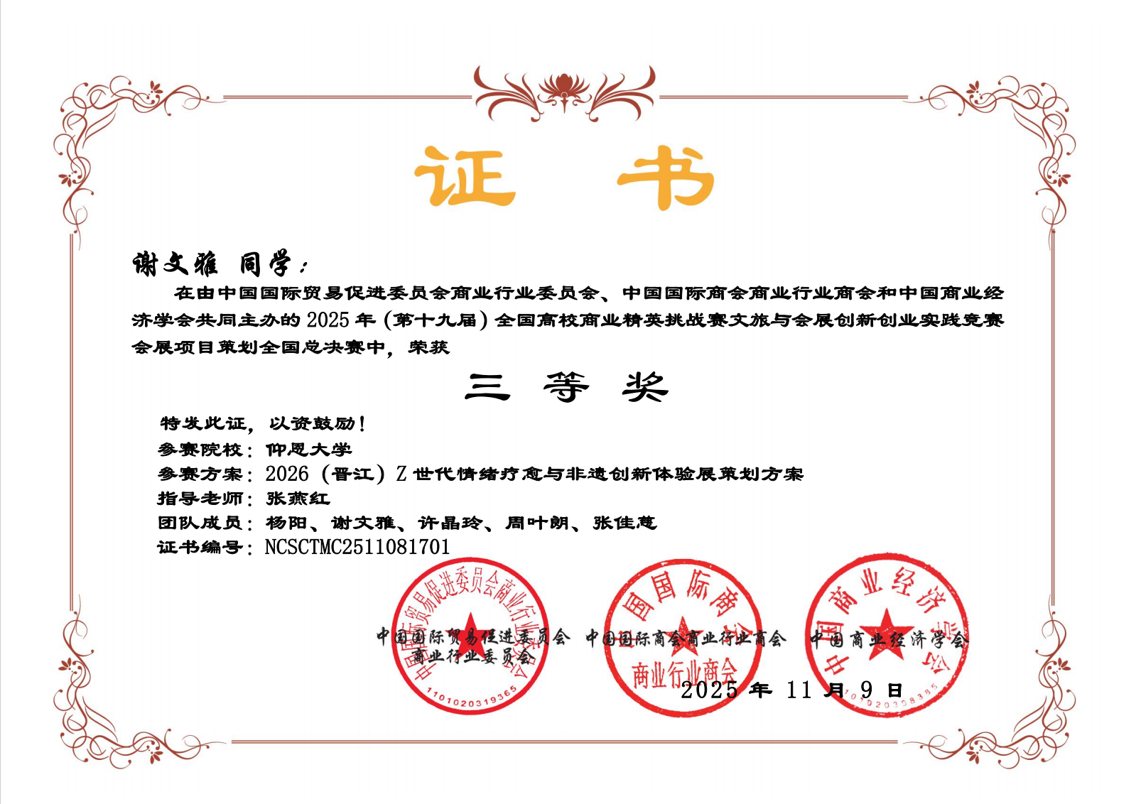 本次竞赛由中国国际贸易促进委员会商业行业委员会、中国国际商会商业行业商会、中国商业经济学会联合主办,已列入《Beat365唯一官方网站2025年学科与技能竞赛项目一览表》,并认定为AB类榜单赛事,吸引了全国多所高校的优秀团队同台竞技。指导教师从项目选题、方案打磨到模拟答辩进行系统辅导。参赛学子围绕文旅融合、会展创新等核心主题,结合专业知识设计兼具实用性与创新性的实践方案,充分展现了管院学子的专业素养与创新能力。